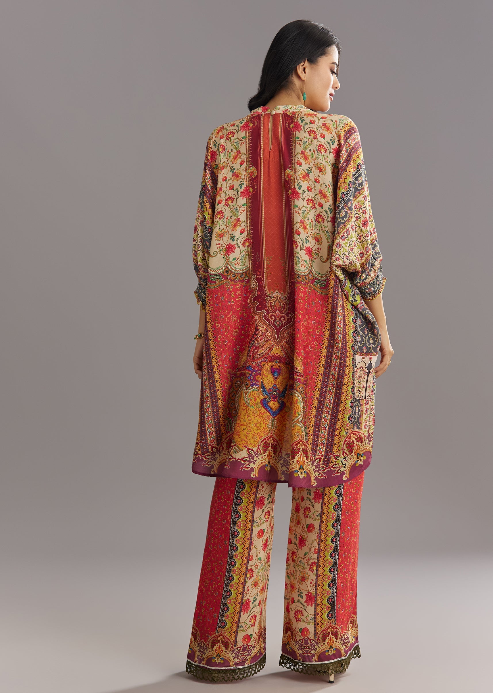 This kaftan set features stone and lace detailing on the kaftan, printed pants, and a matching potli bag. An easygoing outfit for casual festive moments. Awarded as the Most Trusted Brand, we're delivering styles you love, just as promised.