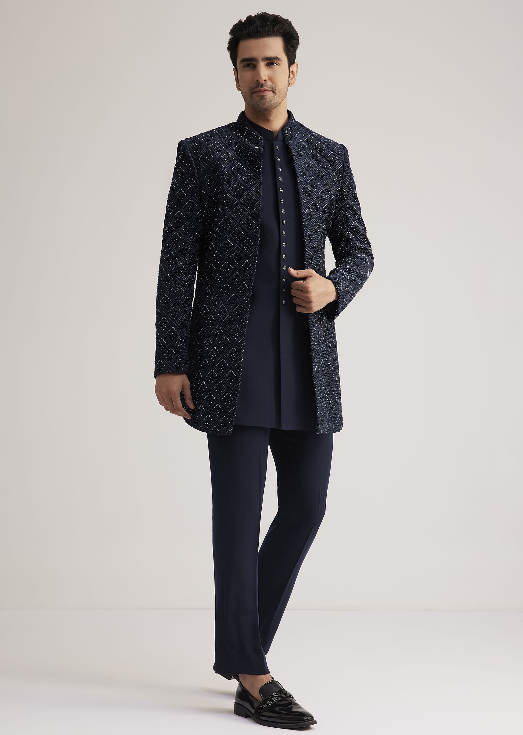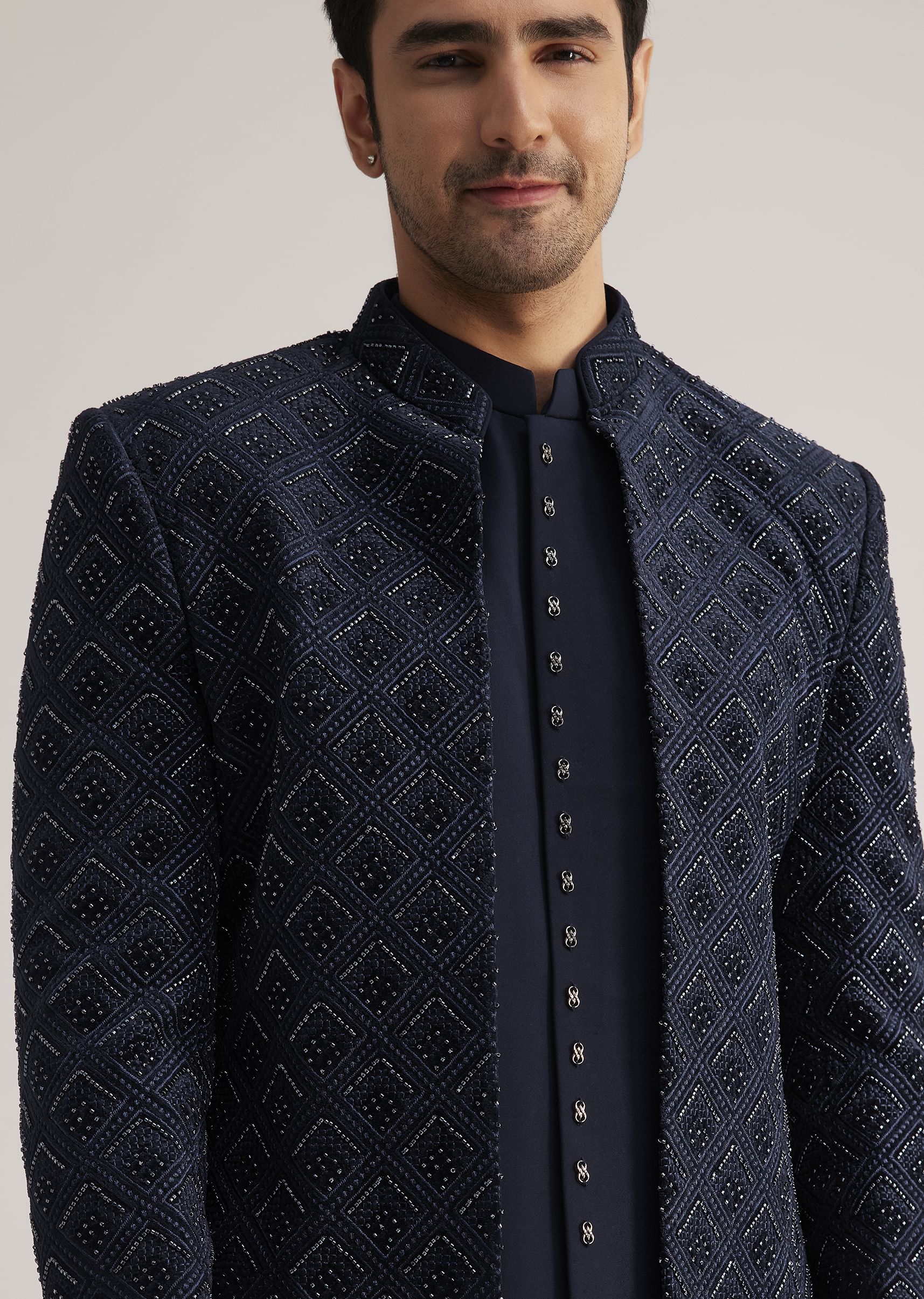 Prussian Blue Sherwani Set With Stone Work Detailing