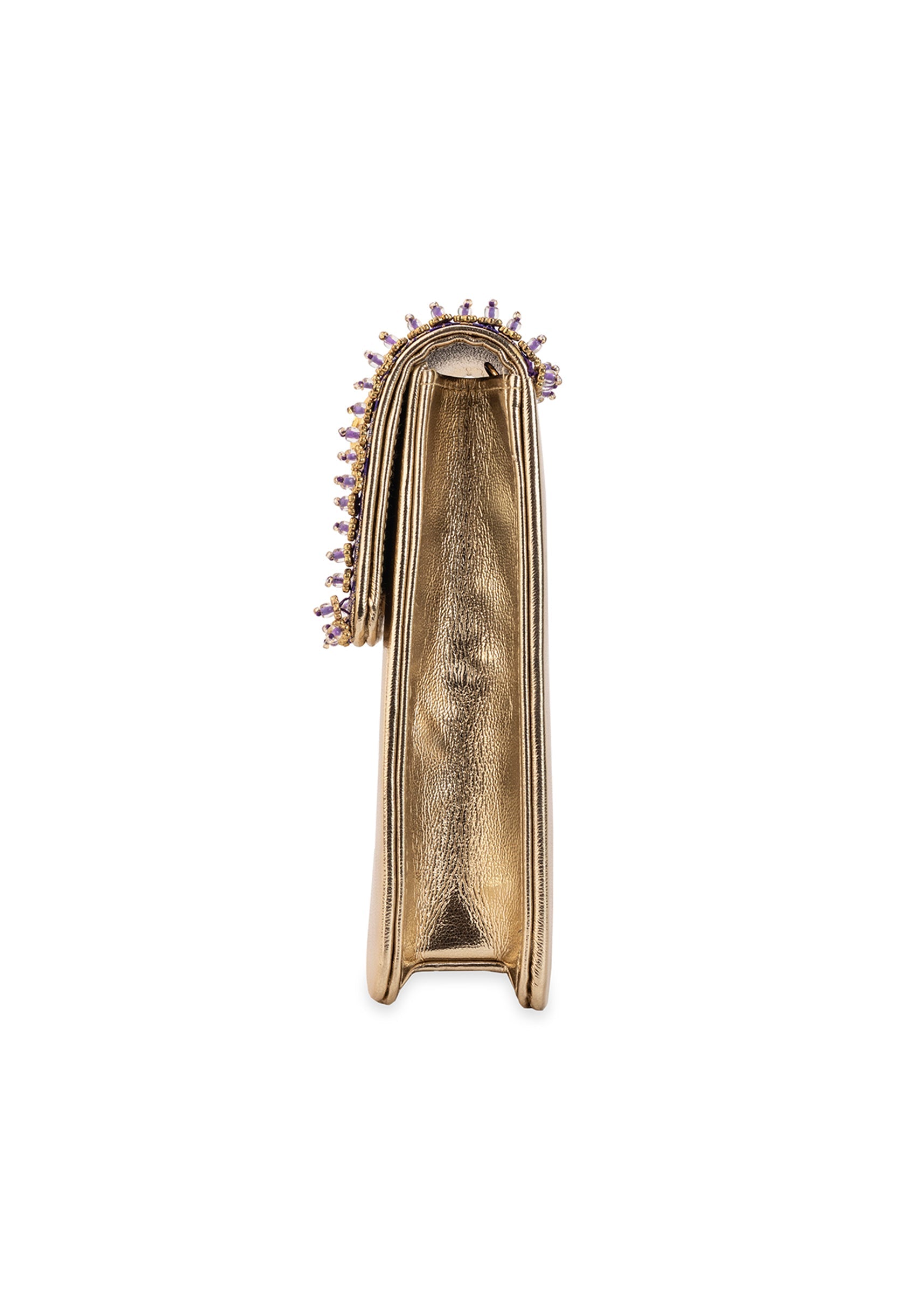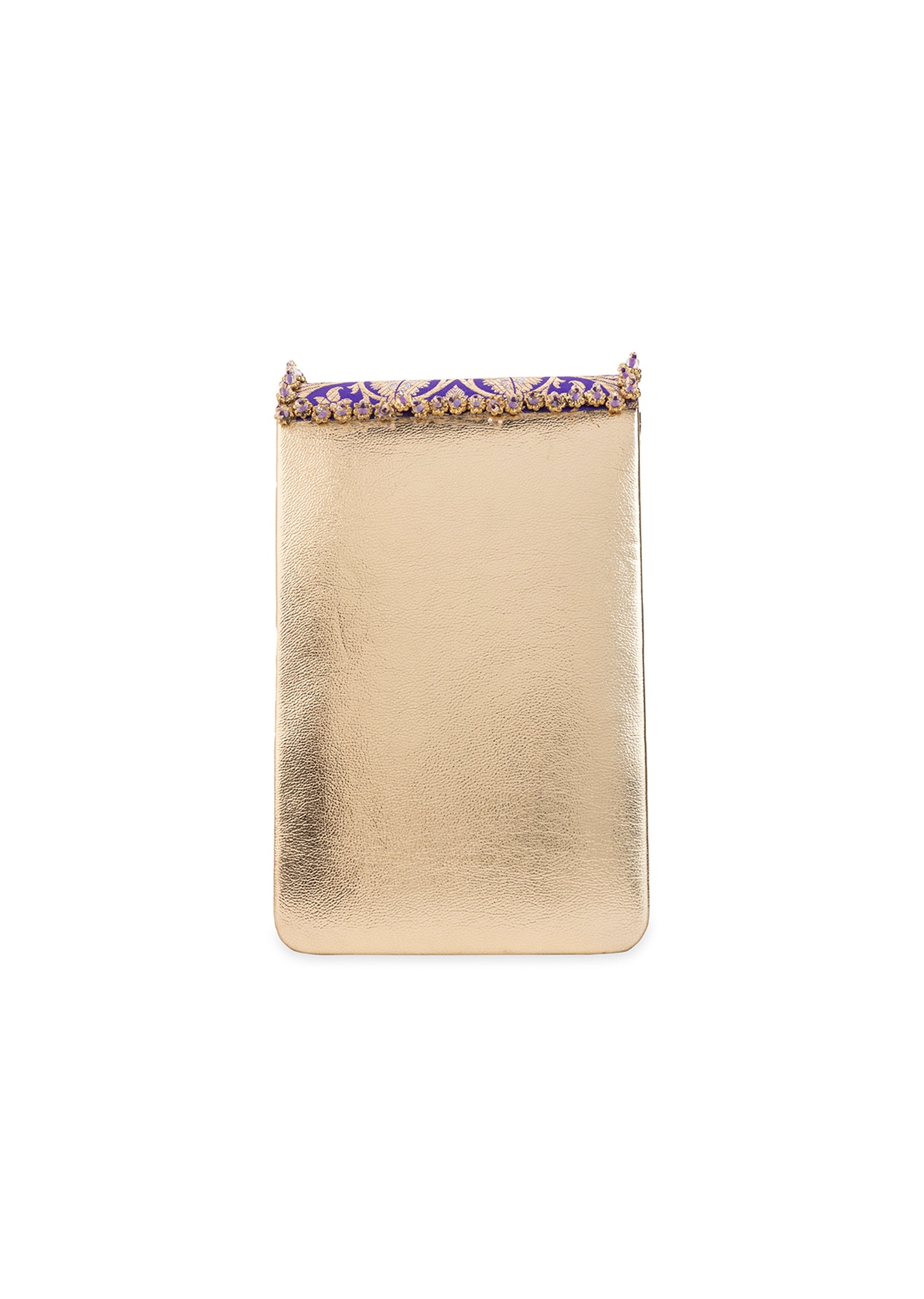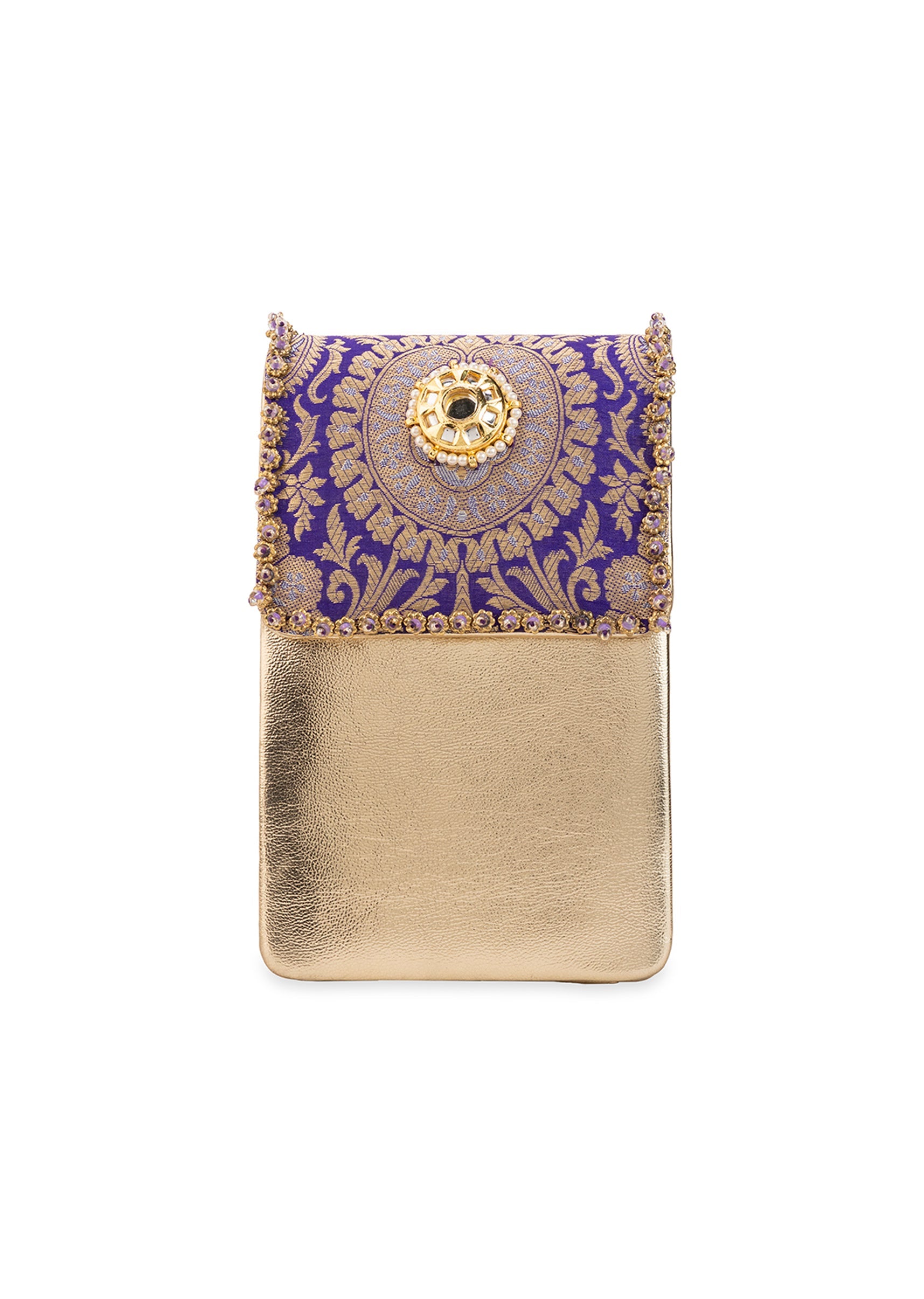Add a touch of royal charm to your celebration look with this purple and gold flap bag, adorned with intricate zari embroidery and a striking central Kundan motif. Its rich... More Product Details