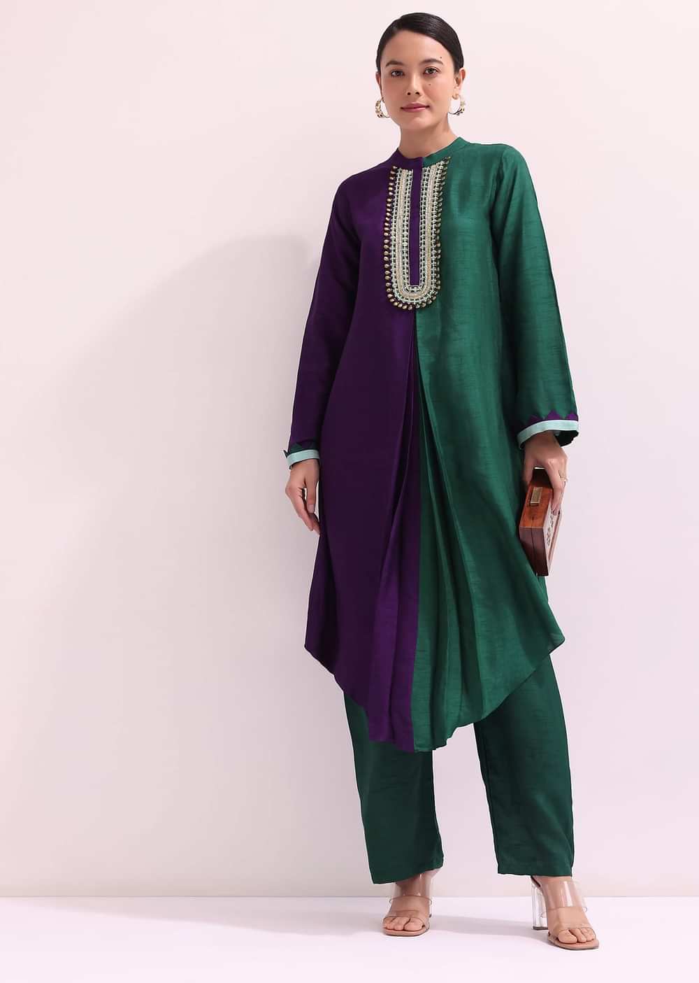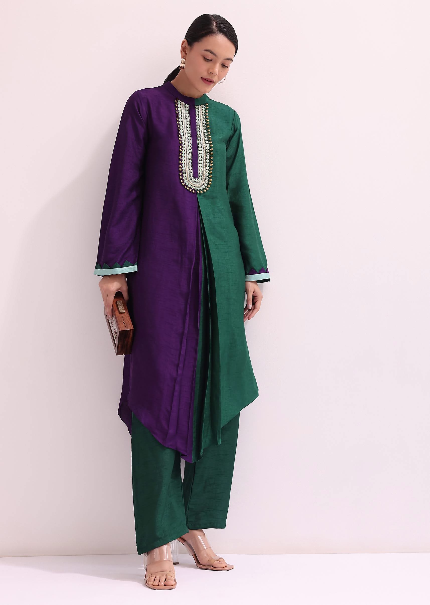 Purple and green embroidered kurta and pantThis set is fabricated from raw silk fabric and enriched with sequins, and bead embroidery Style this set for festive events.This set is paired with a kurta and with Purple or green pant. Awarded As The Most Trusted Brand We'Re Delivering Styles You Love Just As Promised.