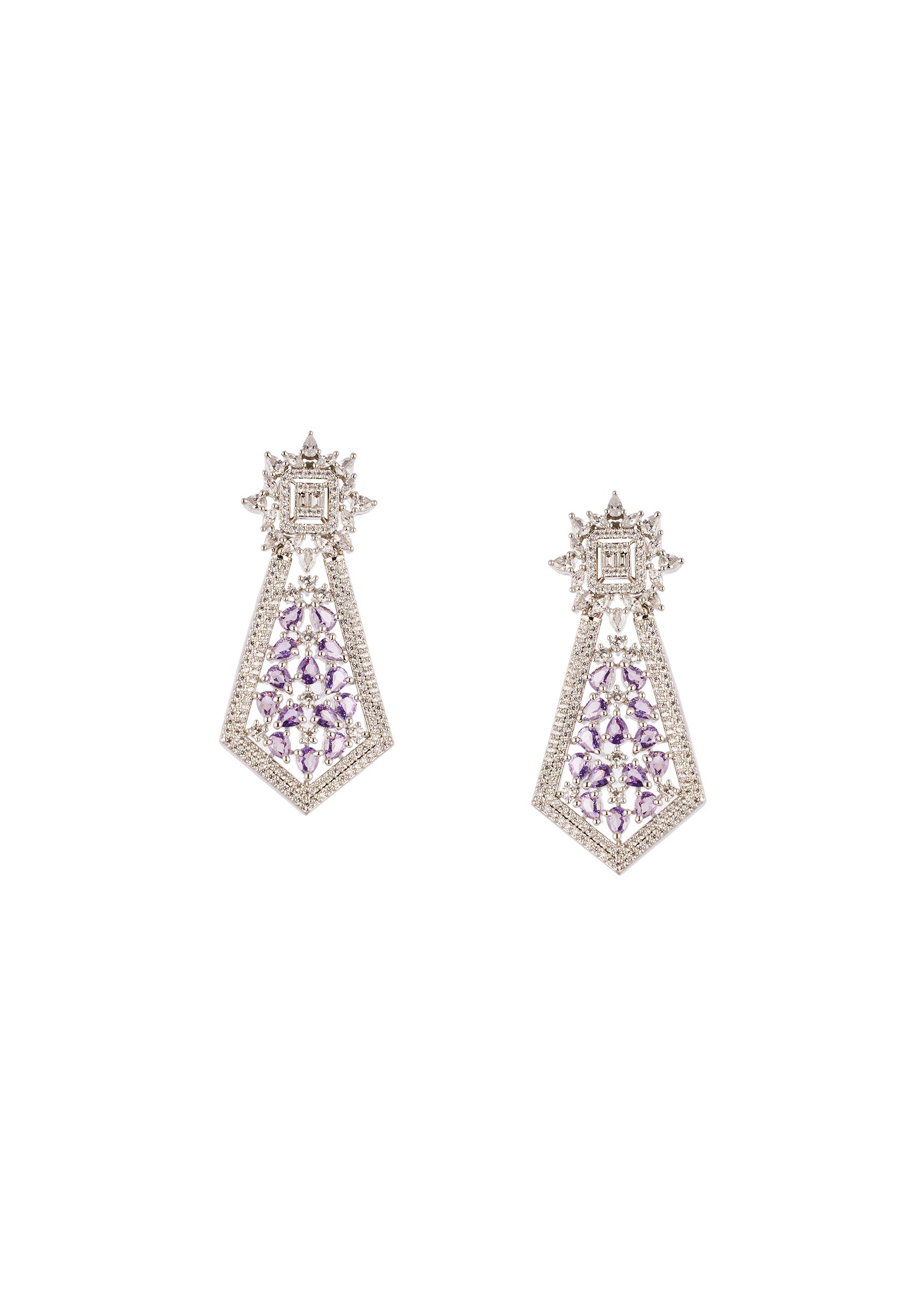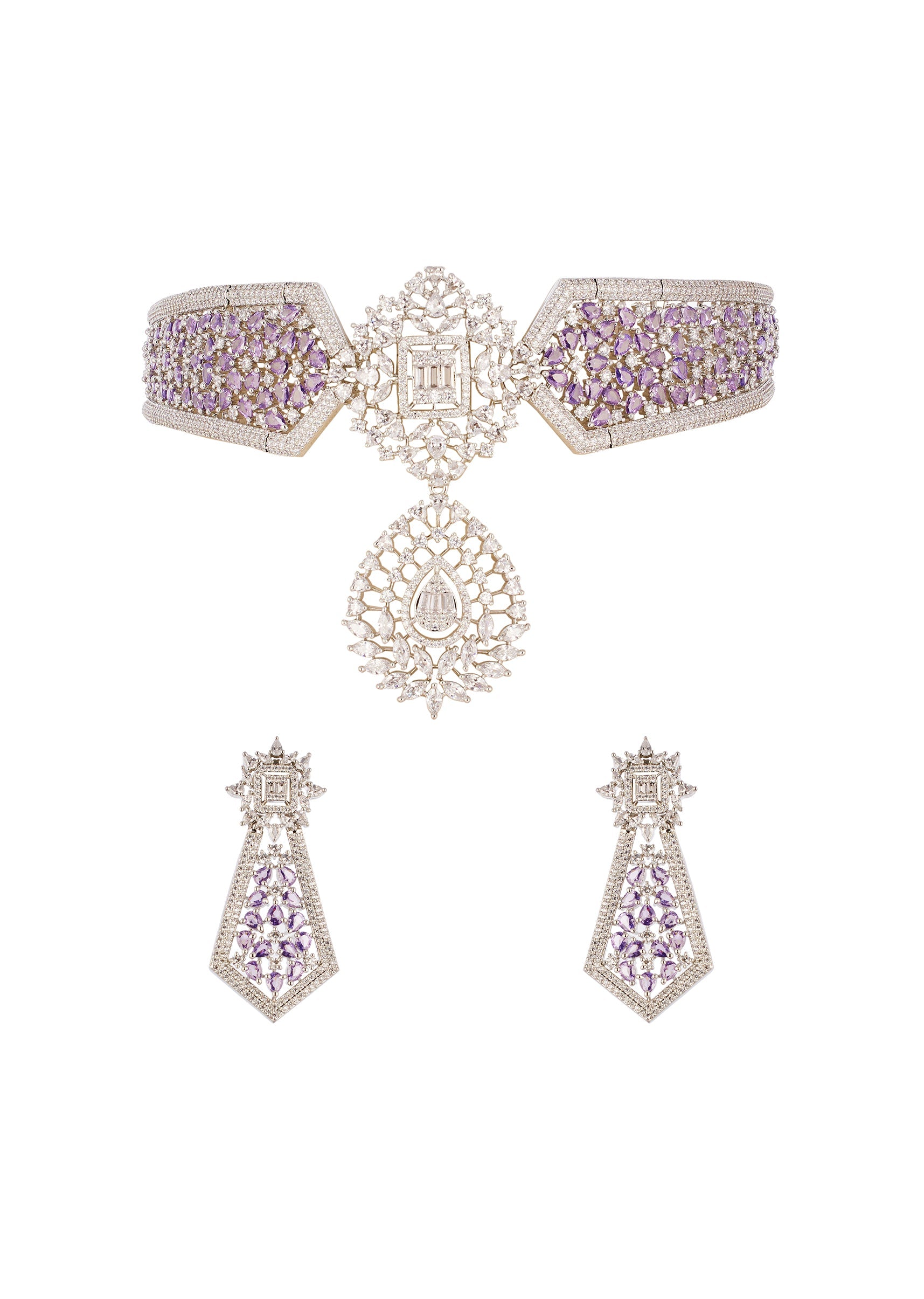 Purple Anti Tarnish Rhodium Plated Long Necklace Set with CZ Diamond