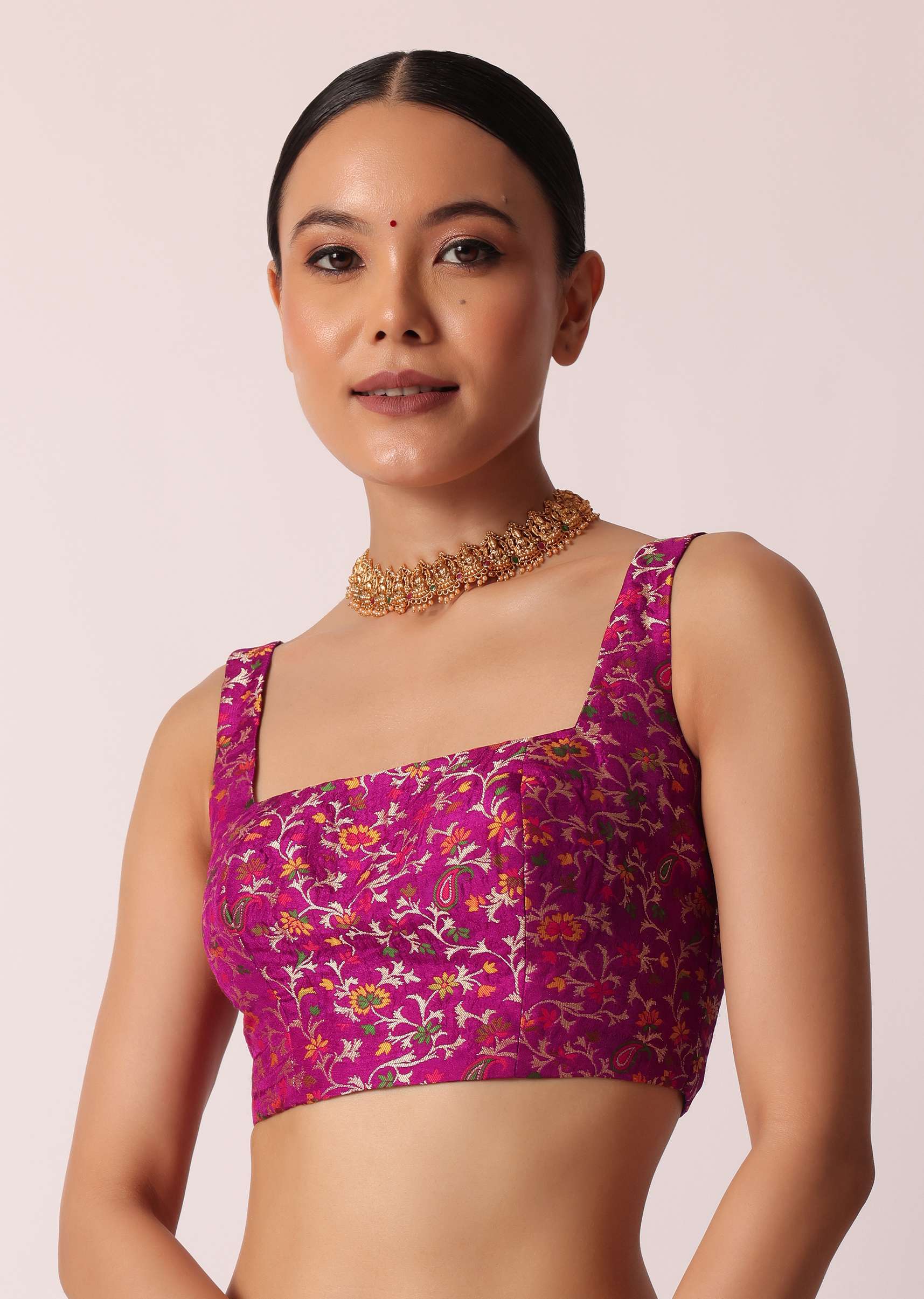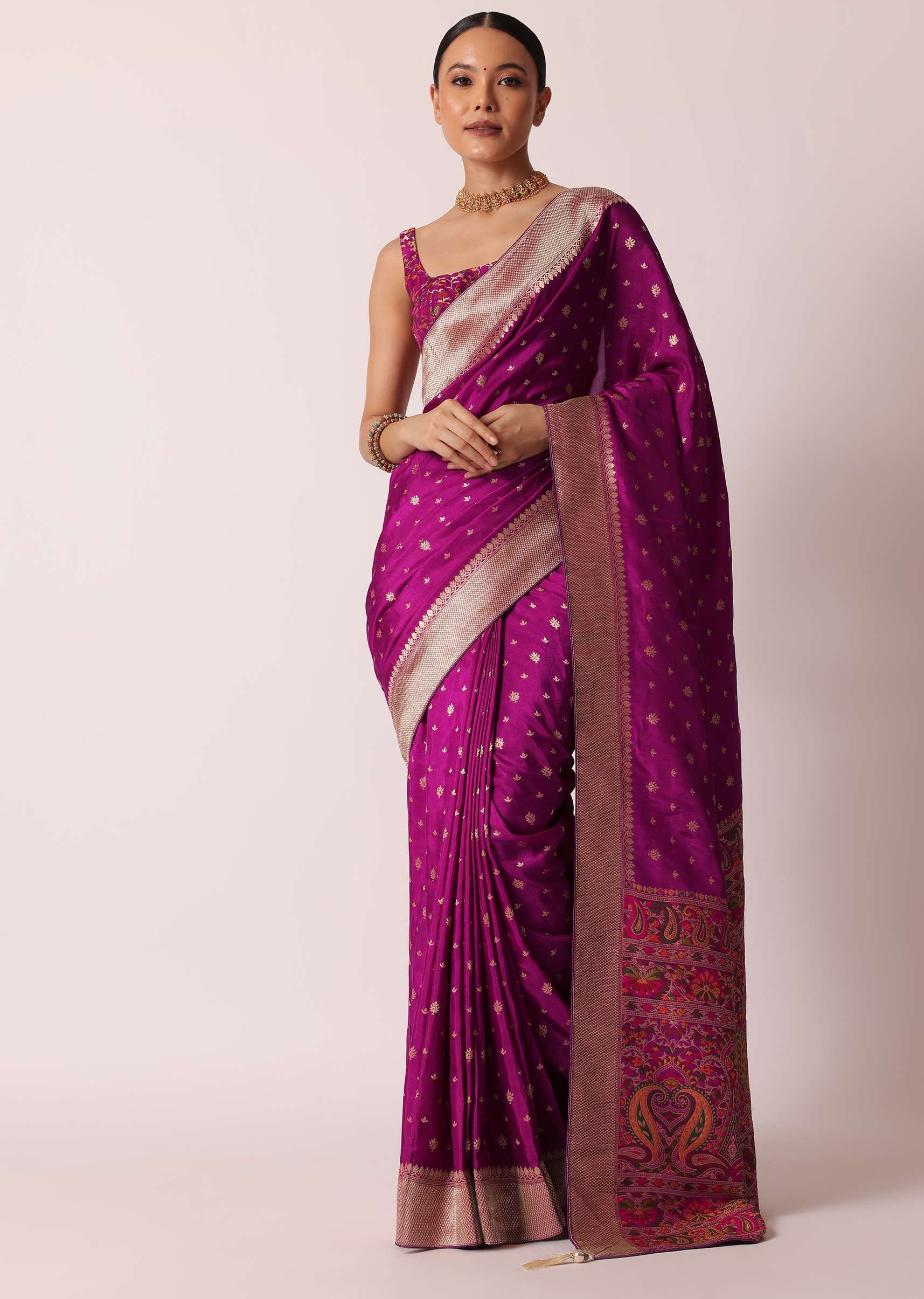 Put forth a mesmerising look by donning this luxurious drape. Adorned with exquisite gold zari weave all-over, this saree is enhanced with Meenakari work on the pallu. Made from rich banarasi dola silk fabric, this handloom beauty is paired with an unstitched blouse piece. Fabricated in a bold purple hue, this saree is an apt pick for celebratory occasions. Awarded as the Most Trusted Brand, we're delivering styles you love, just as promised.