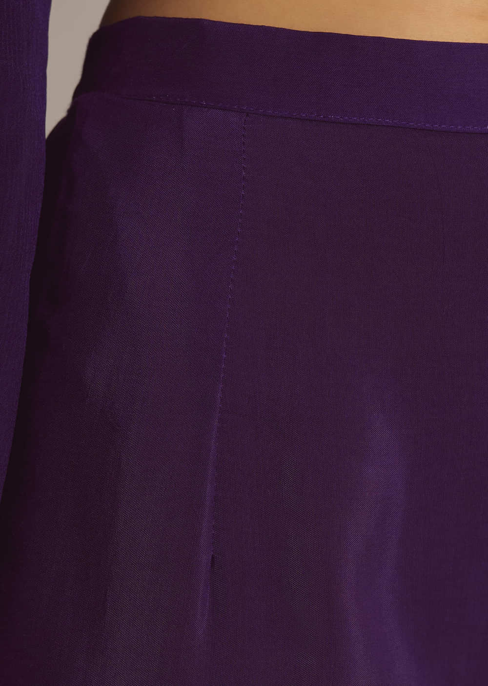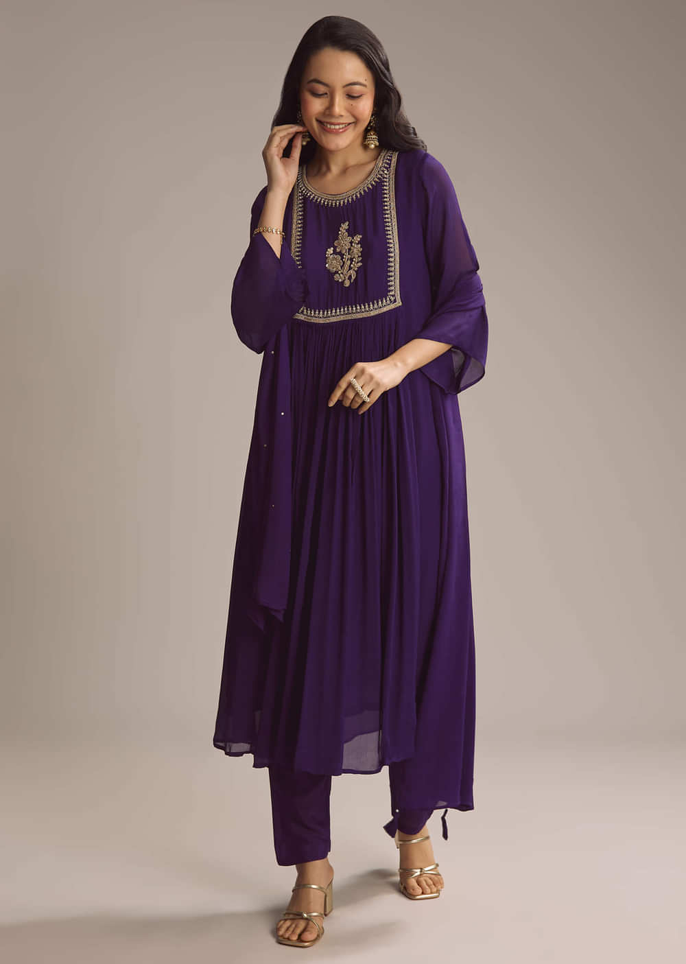 This deep purple chinon anarkali brings a hint of sparkle with its zari work, balanced by the smooth fall of silk blend pants. It feels celebratory from the first step,... More Product Details
