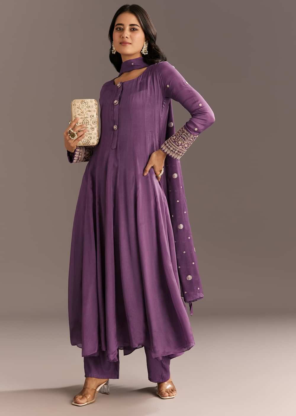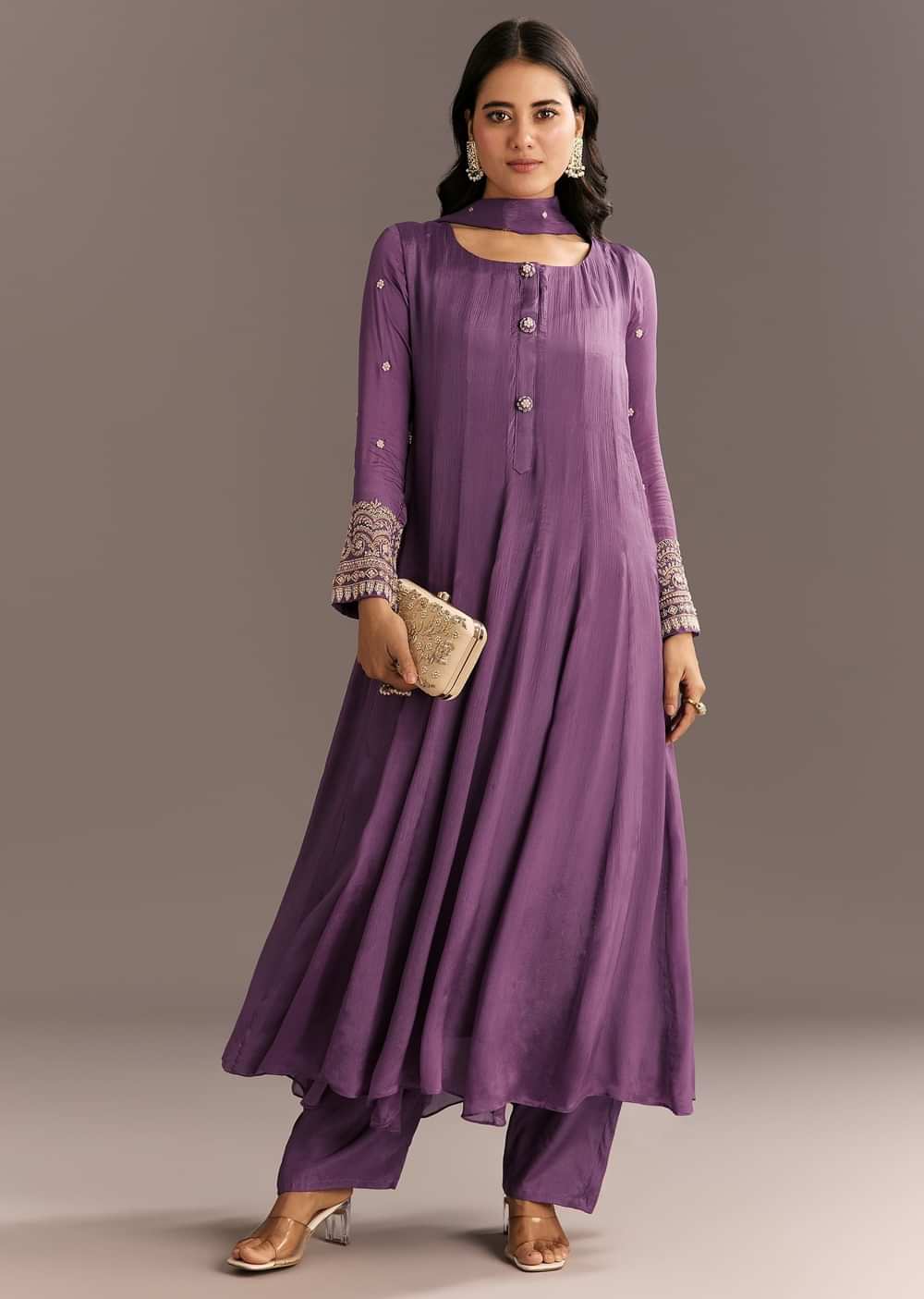 Majestic purple chinon kurta detailed with zardosi sleeves and a matching butti dupatta—perfect for evening gatherings.
