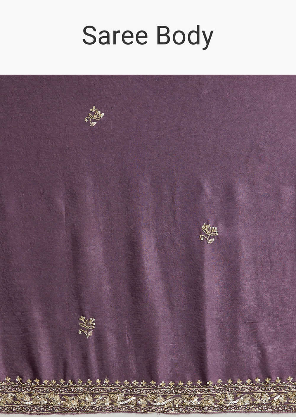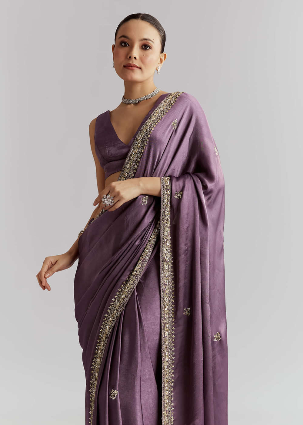 When the lights come on, this purple chinon saree answers with all-over butti and a richly embroidered border that reads couture. Cutdana, sequins and beads add refined shine while the... More Product Details