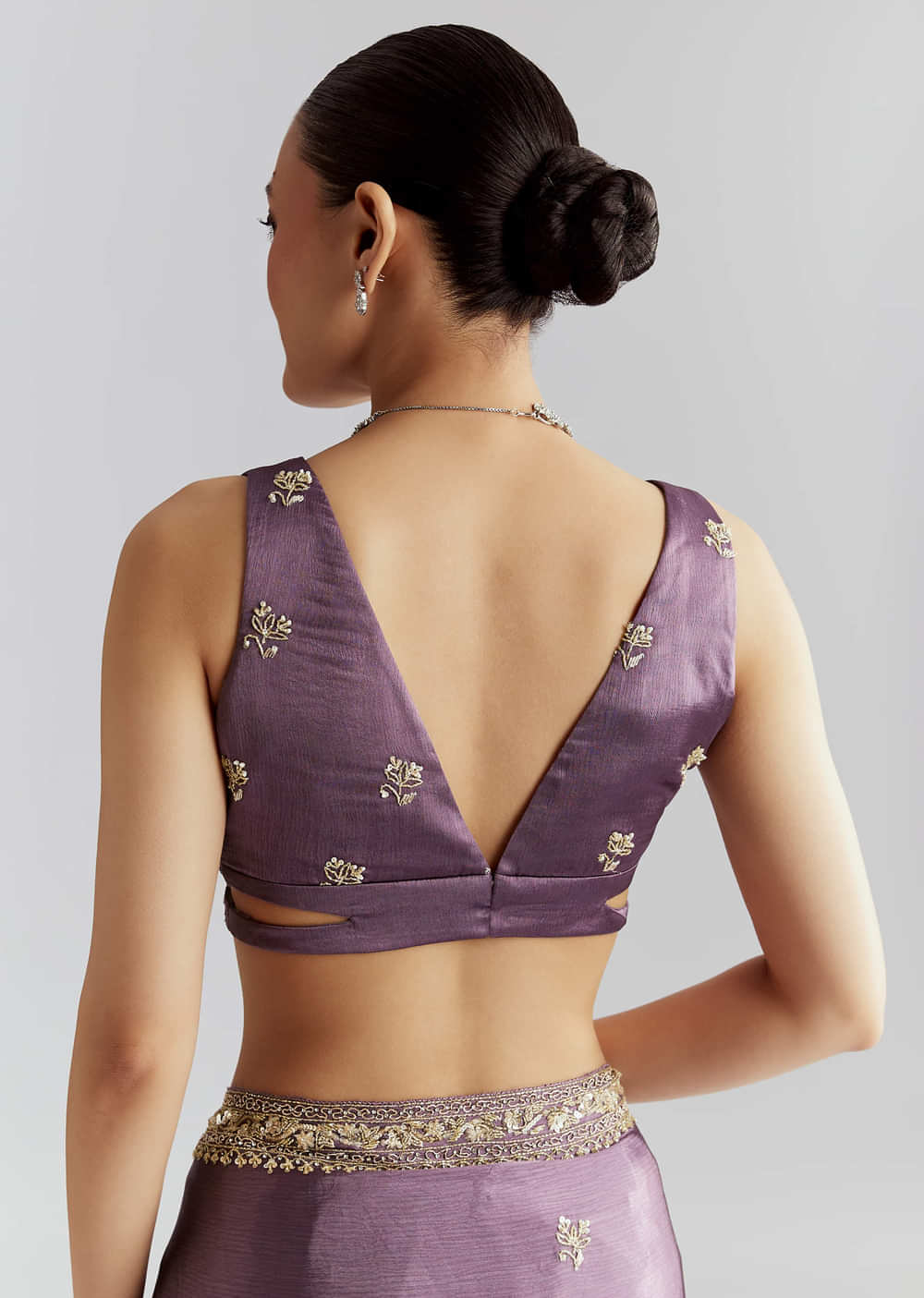 Fit Tips:The blouse should feel fitted and smooth, while the chinon pleats hold their line and the pallu stays set.