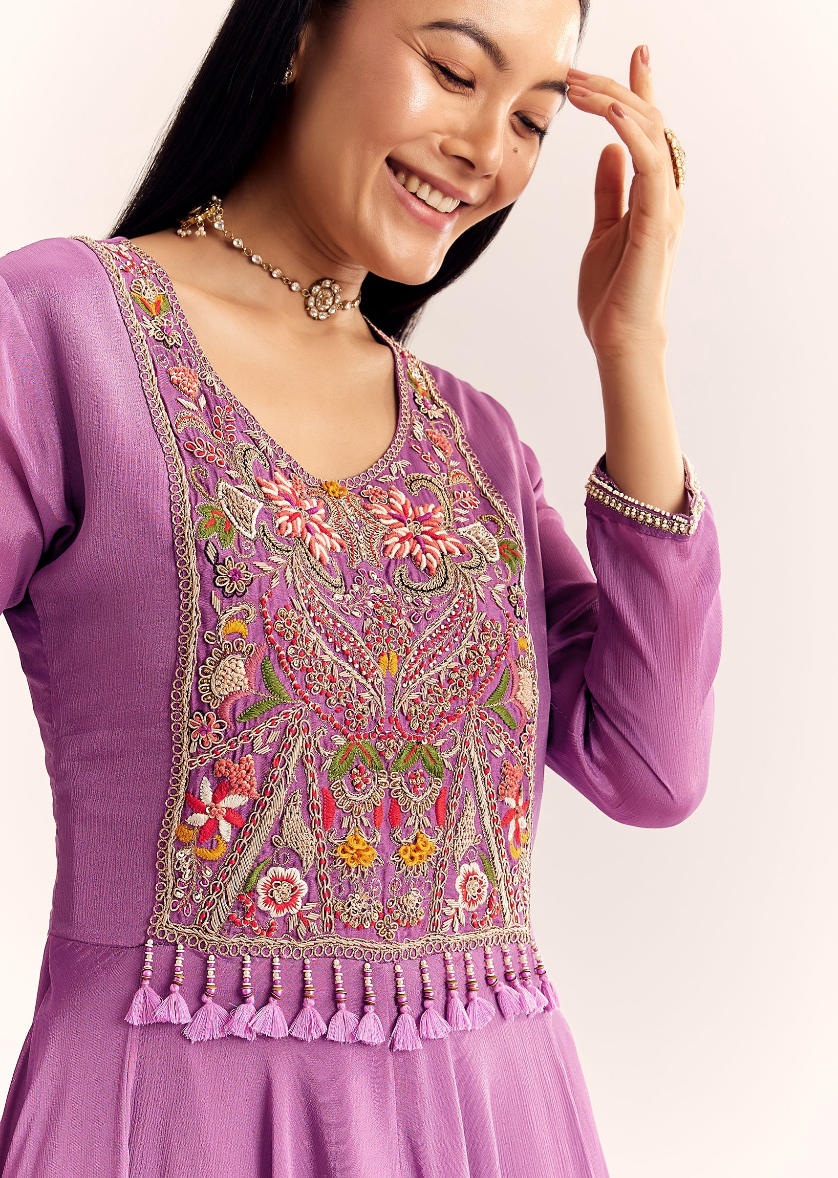 Purple sophistication meets traditional charm in this chinon kurta woven with zardosi, thread and moti work. Echoes of royalty in every fold.Sleeves border design may vary.Awarded as the Most Trusted... More Product Details