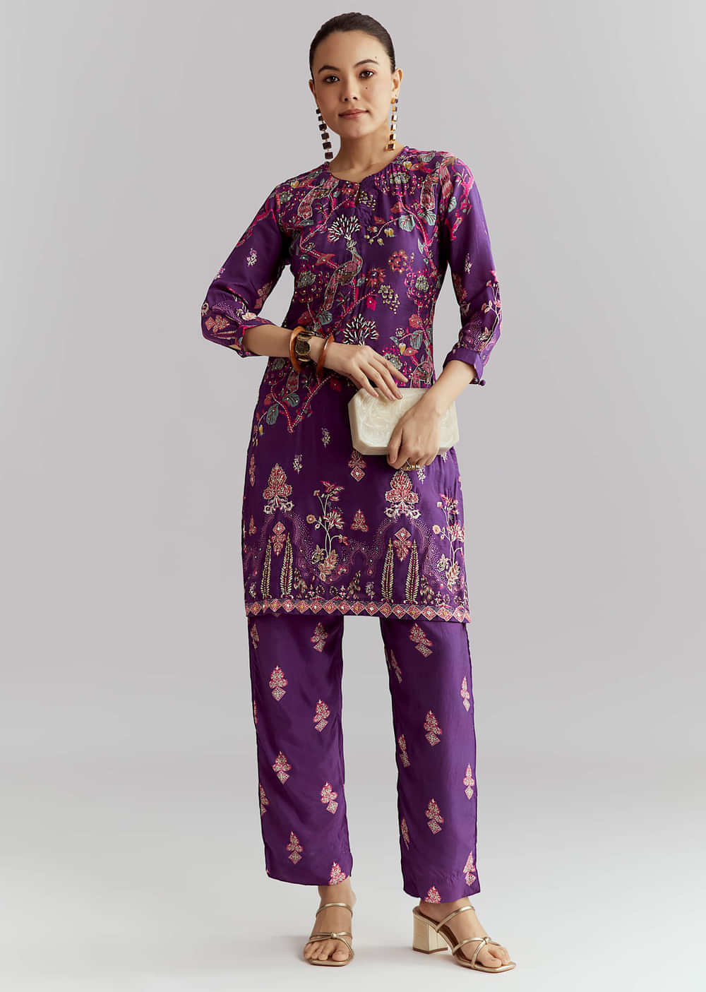 Purple Crepe Printed Co Ord Set With Sequins And Beads Work