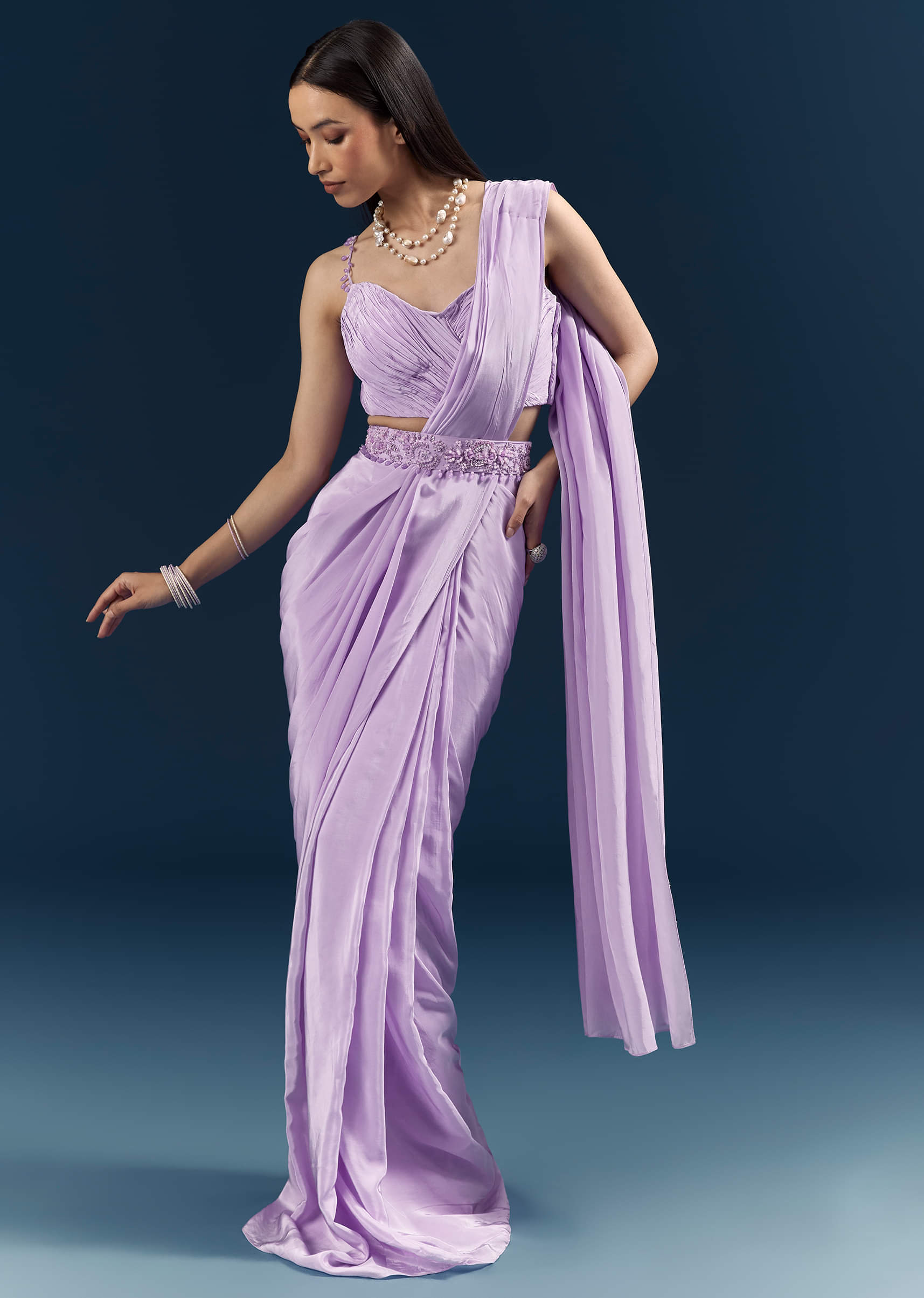 Purple crepe sets a rich tone, and this ready pleated saree glimmers with sequins, French knots, cutdana, and stone work. It is a chic guest look that is celebratory without feeling over the top. Awarded as the Most Trusted Brand, we're delivering styles you love, just as promised.