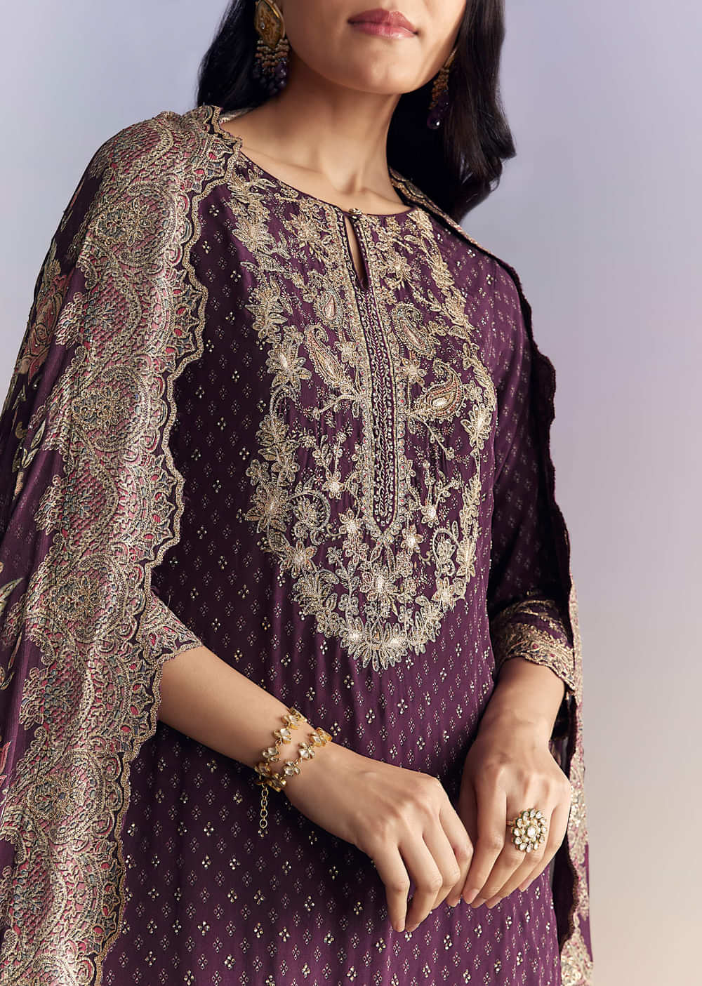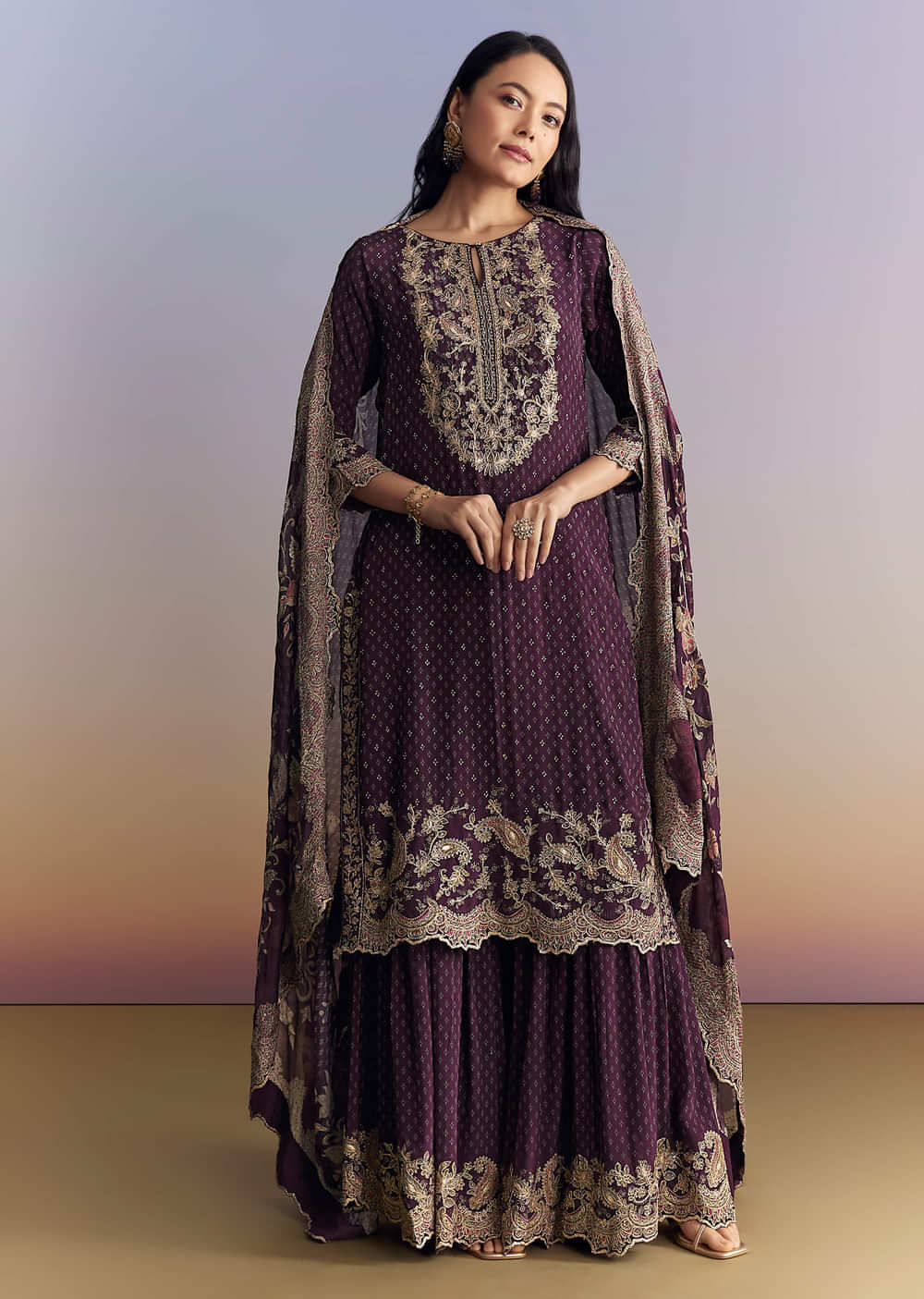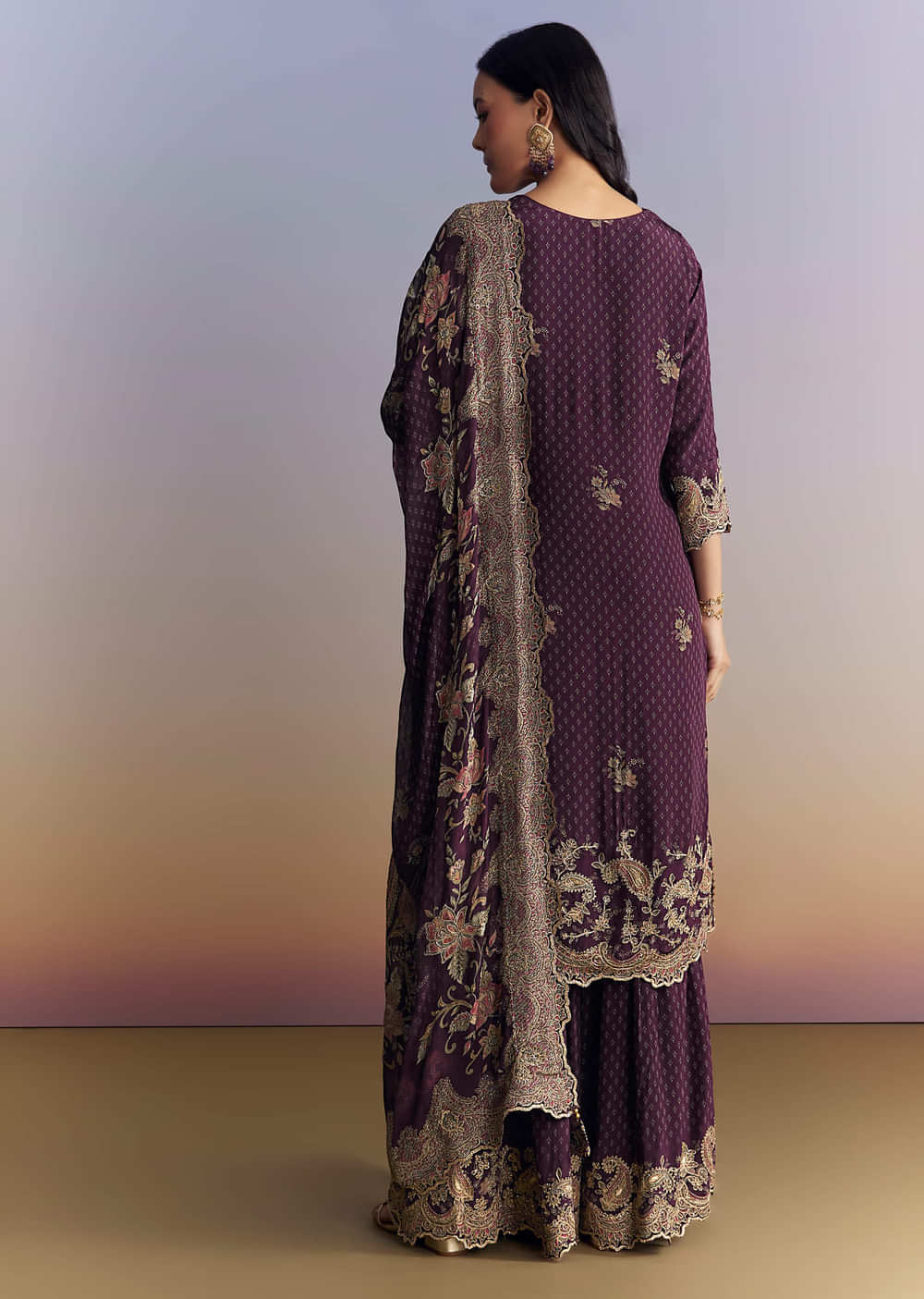 Purple Crepe Sharara Suit With Indie Print And Zari Work