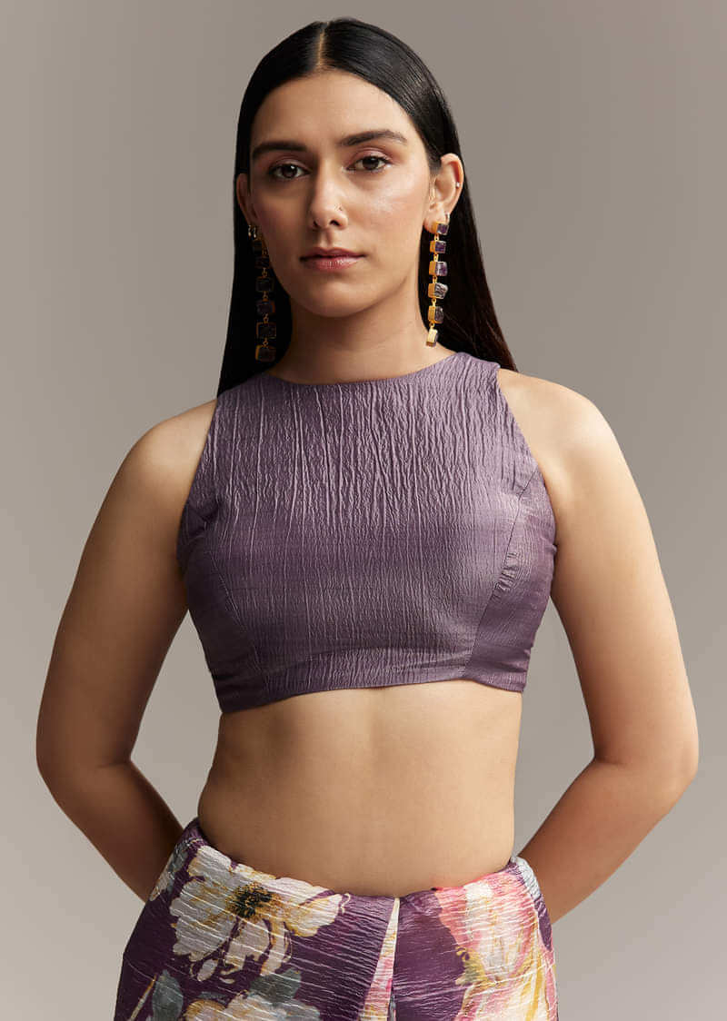 Purple Crush Tissue Saree With Floral Print And Embroidered Border