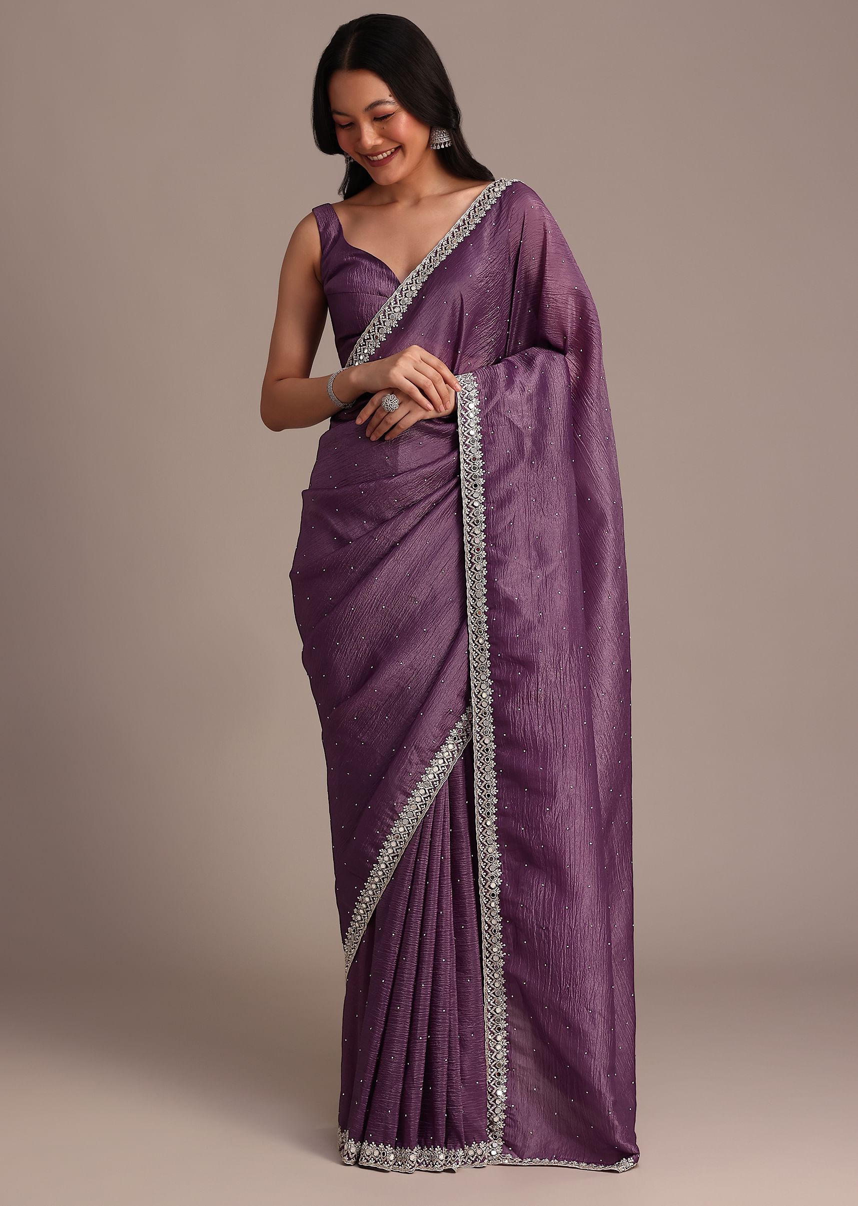Add a pop of color to your occasion wear with this purple crushed tissue saree. Embellished with mirror and cutdana detailing along the border this saree brings a unique charm to traditional elegance perfect for sangeets or receptions. Awarded as the Most Trusted Brand, we're delivering styles you love, just as promised.