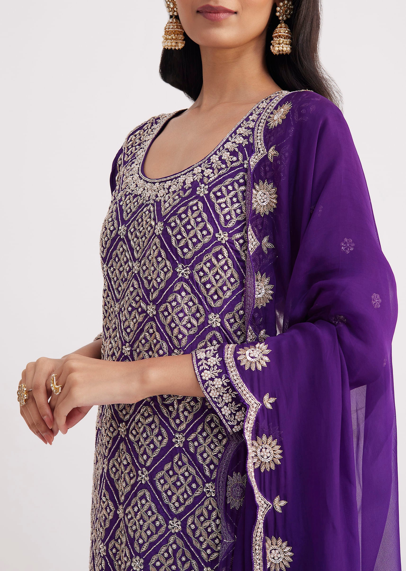 Purple Cutdana Embroidered Sharara Suit With Organza Dupatta