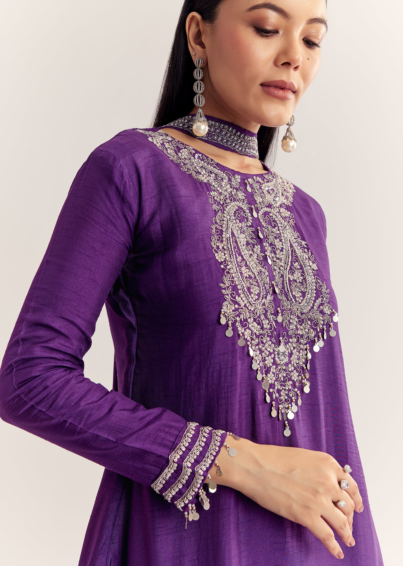 Purple Dola Silk Kurta Set With Zardosi And Choker Dupatta