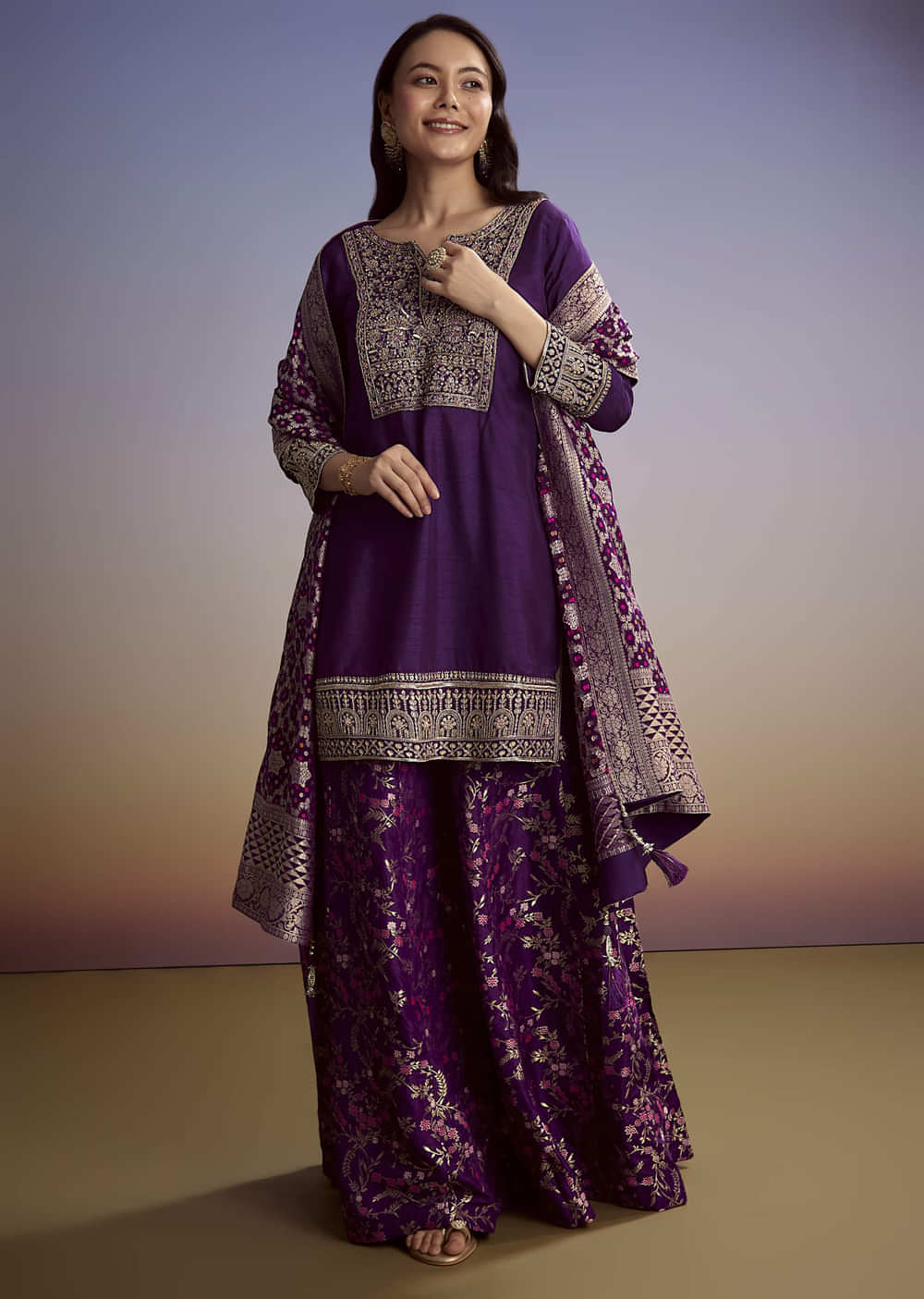 A little bit traditional, a little bit dramatic, this purple dola silk palazzo suit layers an embroidered kurta with a rich Banarasi silk palazzo and a bandhani georgette dupatta. It... More Product Details
