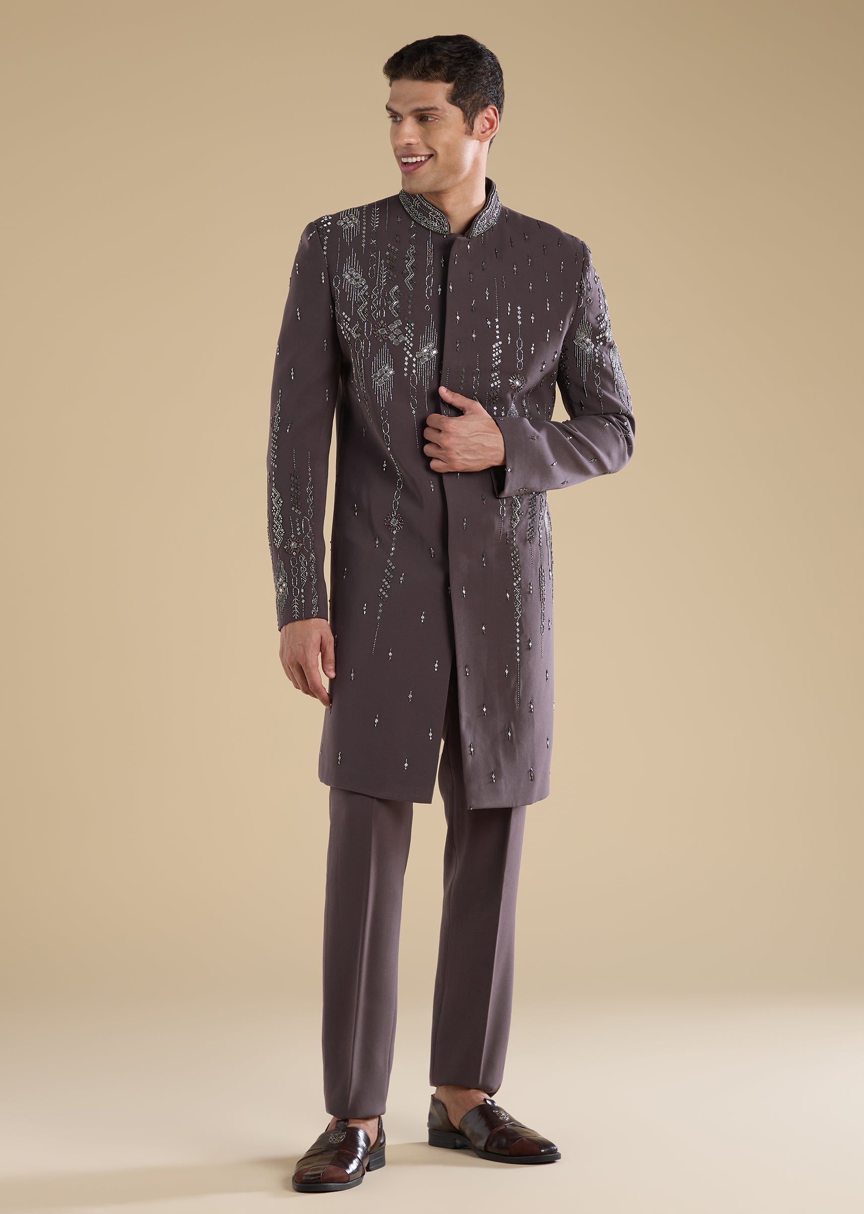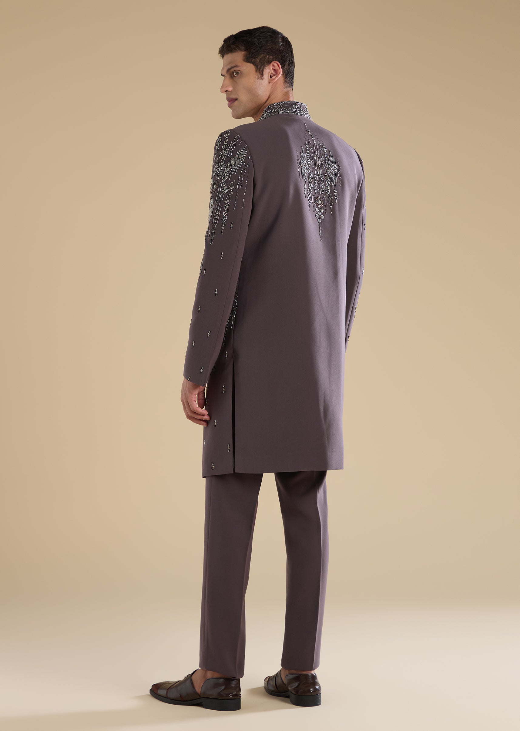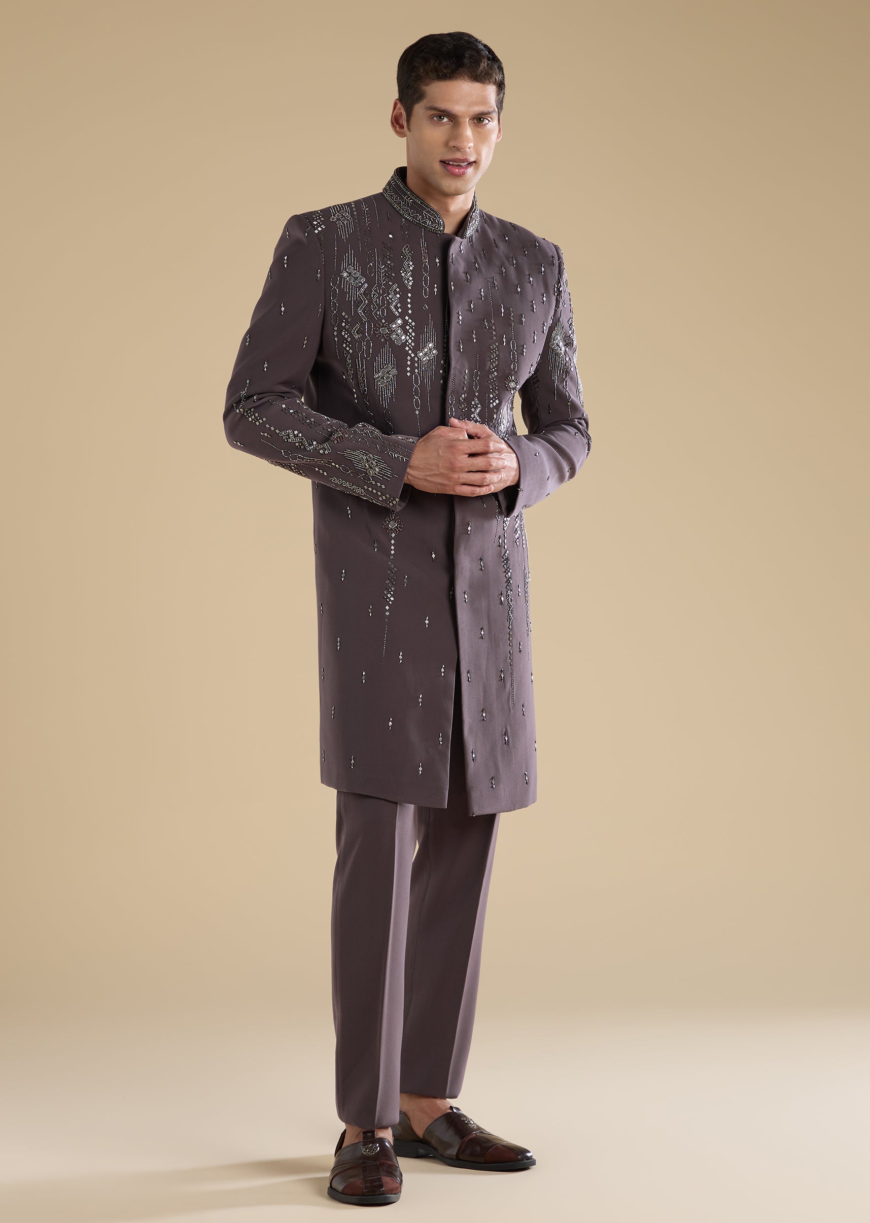 Designed in structured polyester, this purple indo-western set is elevated with thread, bead and cut dana embellishments. Featuring a mandarin collar, full sleeves and front hook-eye and button closure, it... More Product Details