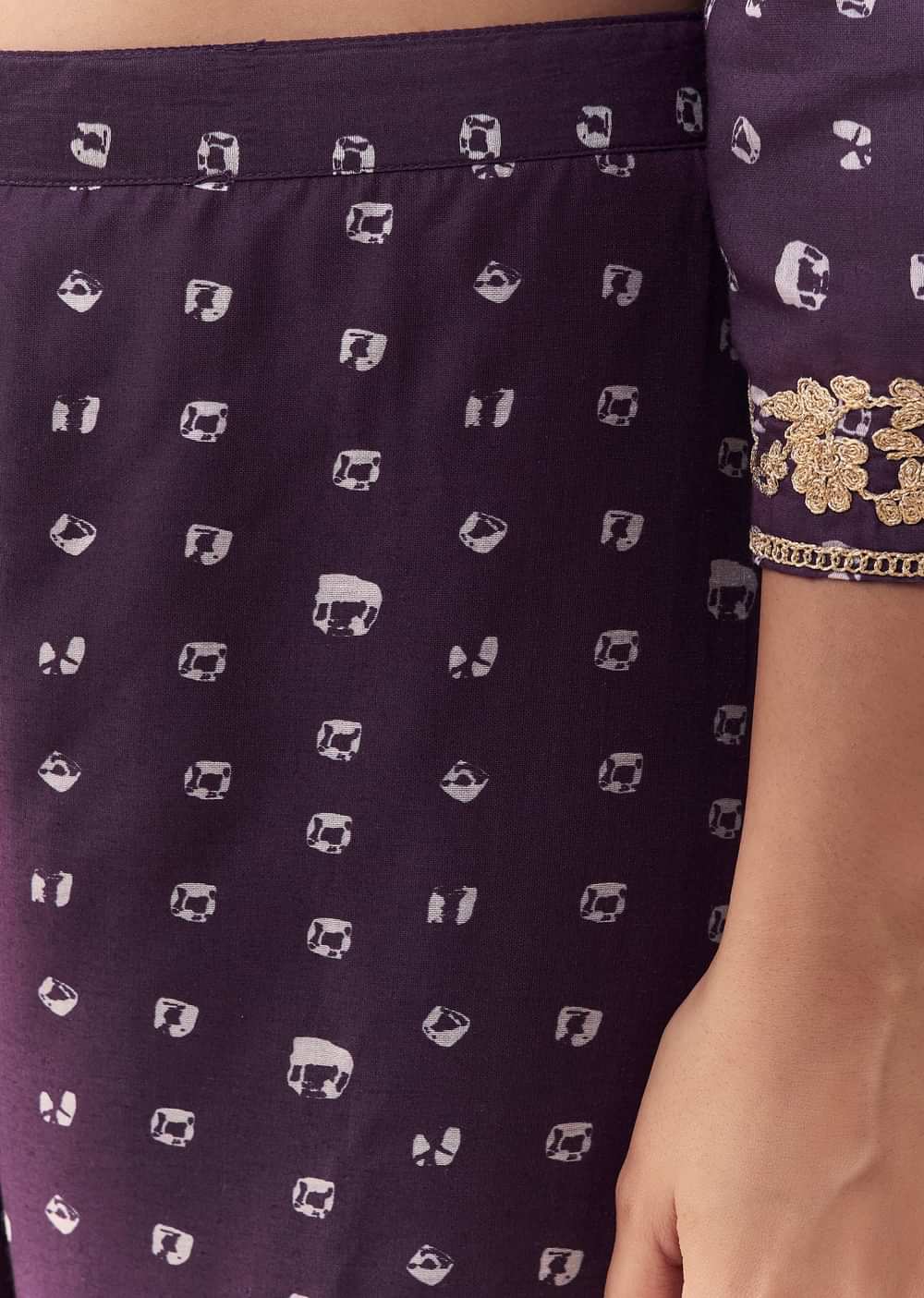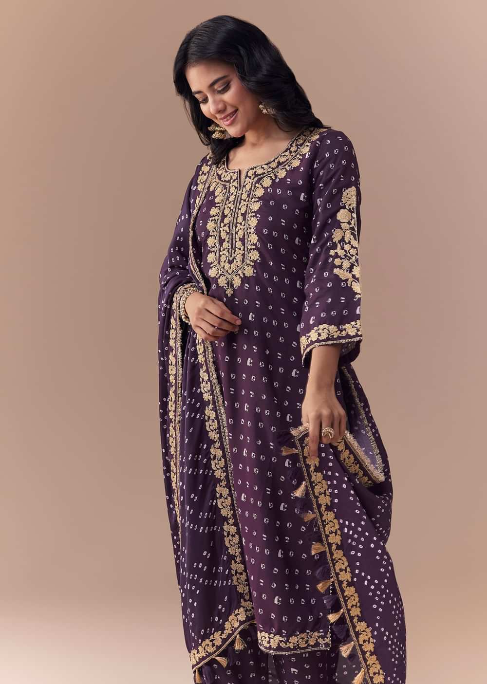 Shimmering zari work enhances the bandhani print, creating a purple kurta that glows beautifully for festive occasions. The silk pant and dupatta add luxurious depth, making it ideal for celebrations... More Product Details