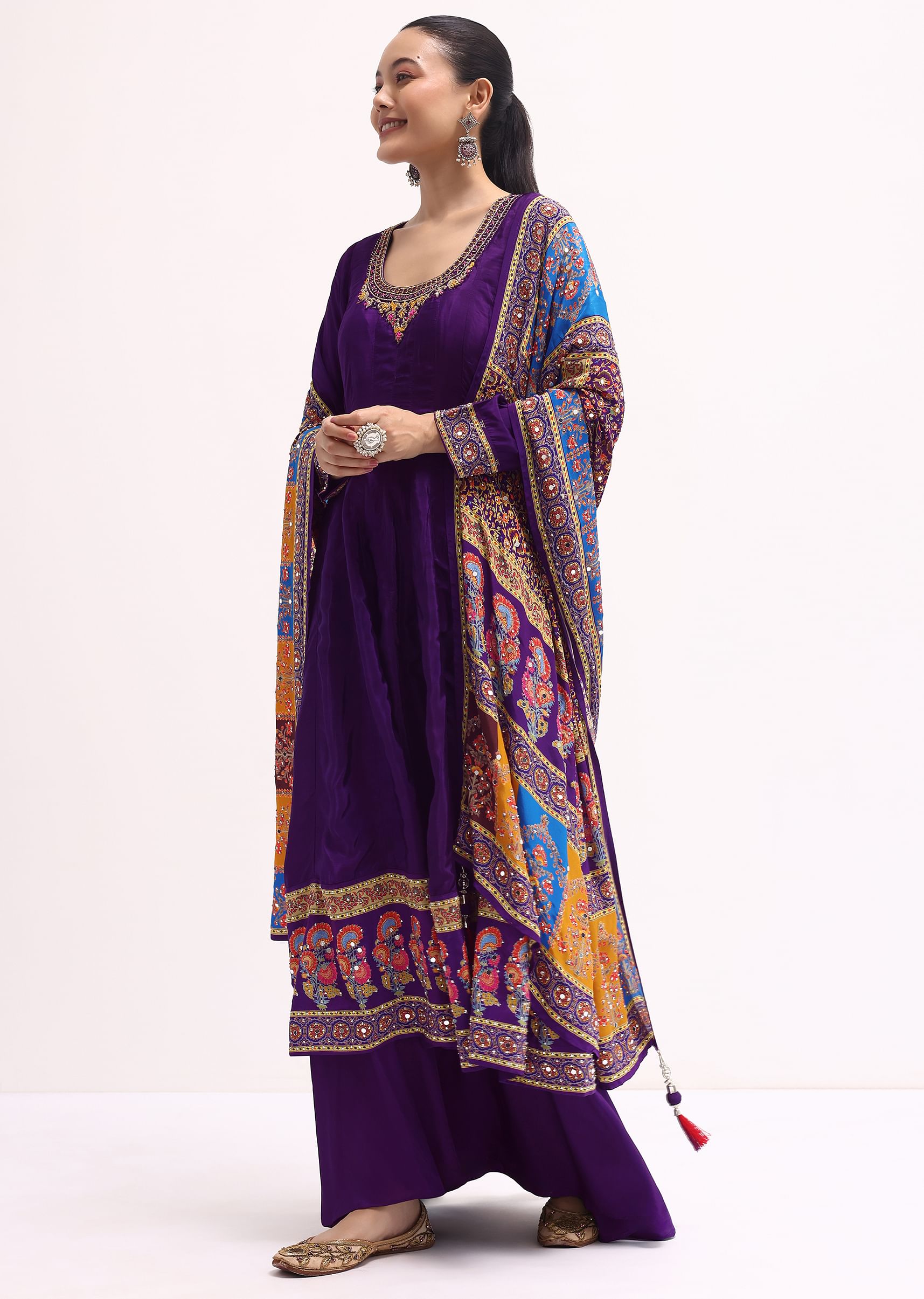 Discover the charm of our purple kurta palazzo set, perfect for sangeets and festive occasions. This set is crafted from crepe and adorned with prints, cut dana, mirrors, sequins, and... More Product Details