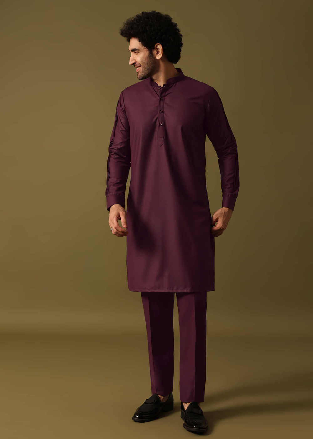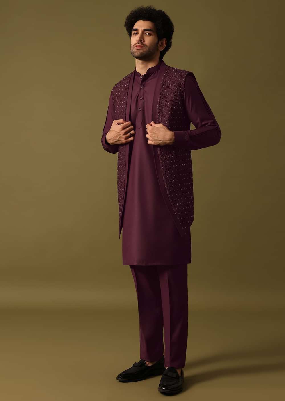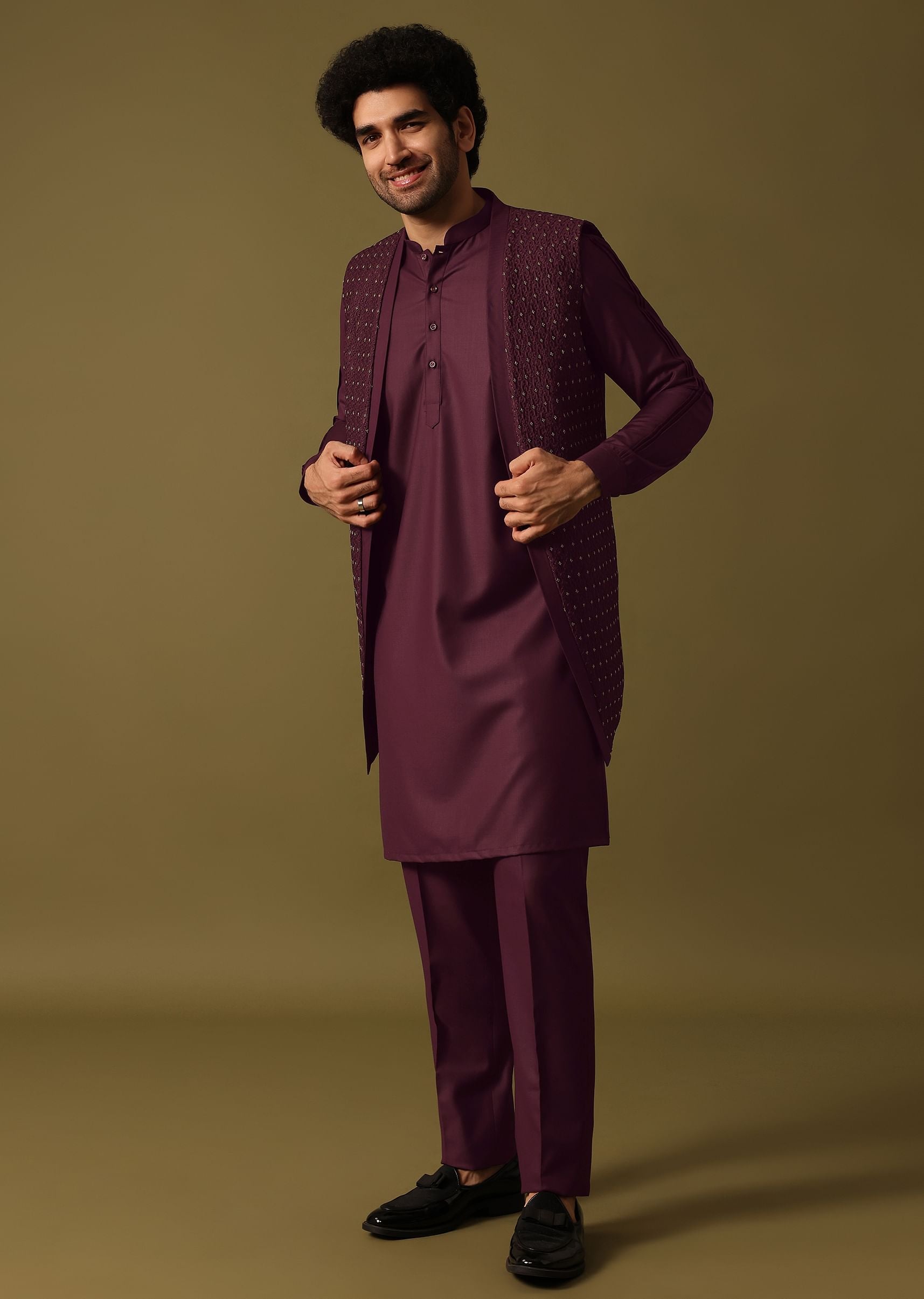 Embrace festive elegance in our purple kurta jacket set crafted from terry rayon and featuring intricate threadwork and bead embroidery. This ensemble showcases a stylish kurta alongside a complementing jacket and perfectly fitted pants. Awarded as the Most Trusted Brand, we're delivering styles you love, just as promised.