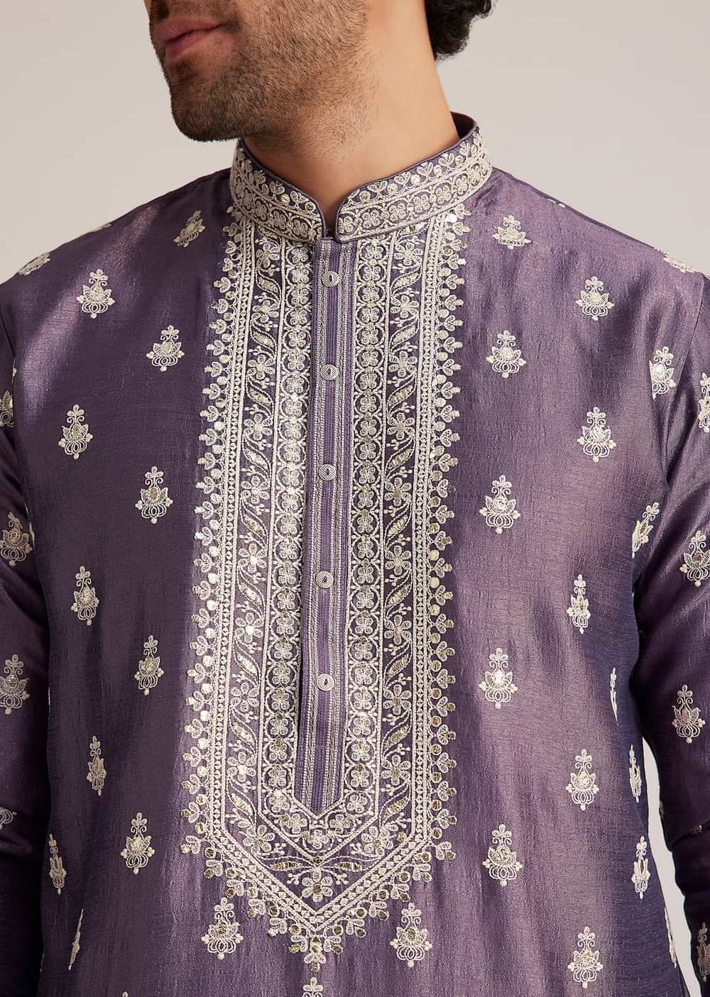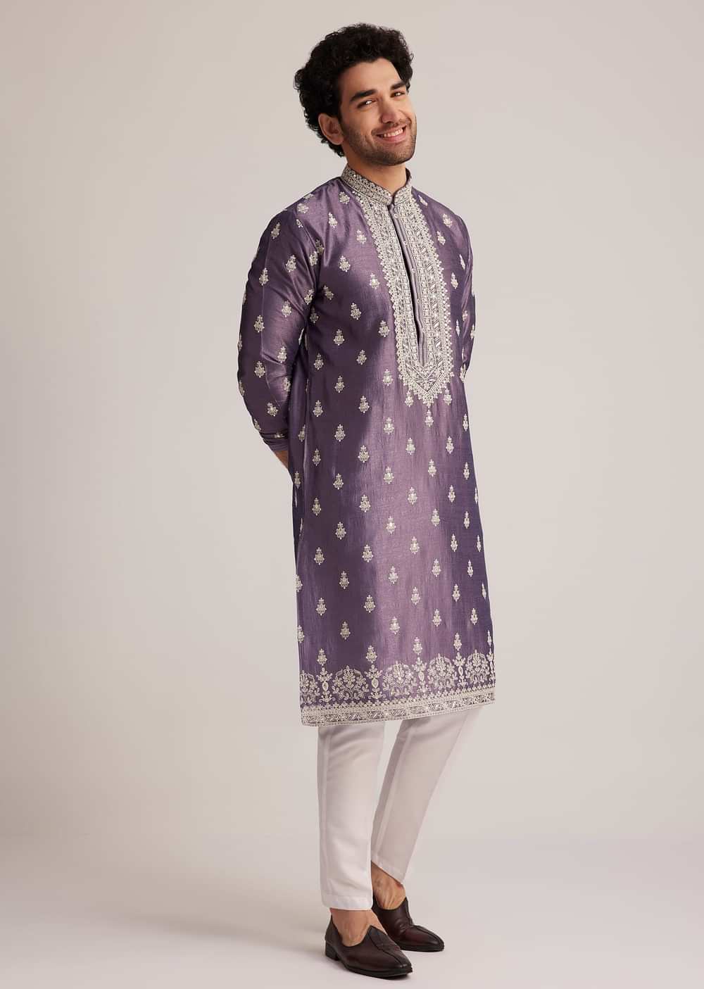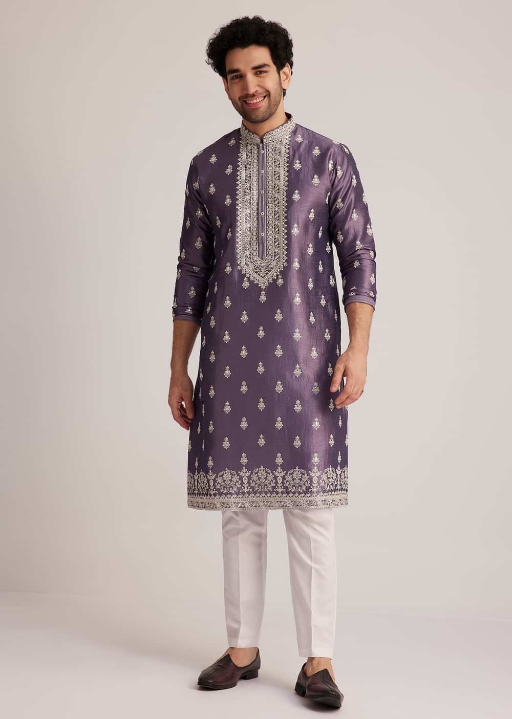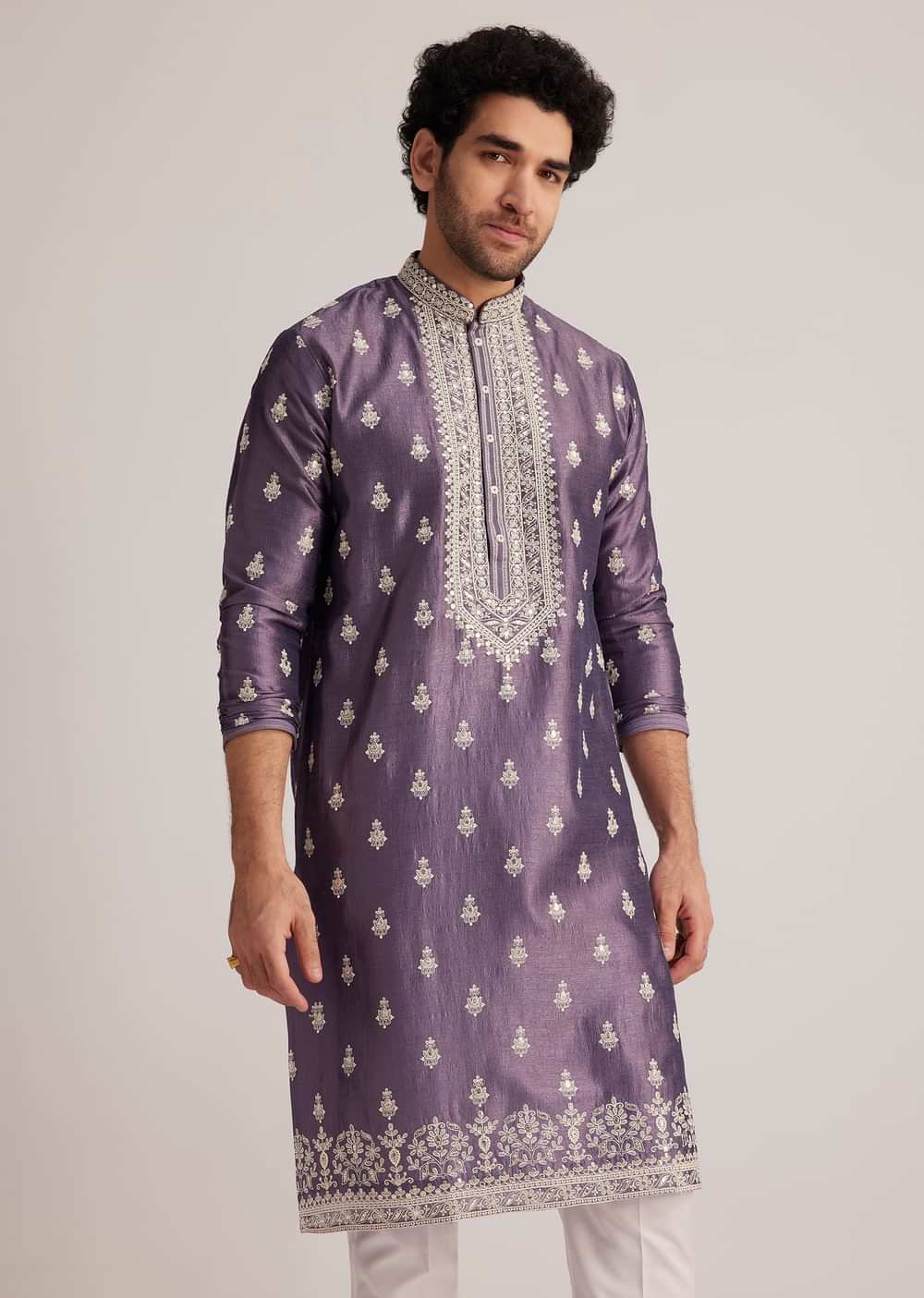 - Exude royal elegance with this purple kurta set, adorned with intricate silver embroidery and ornate detailing along the neckline and hemline.