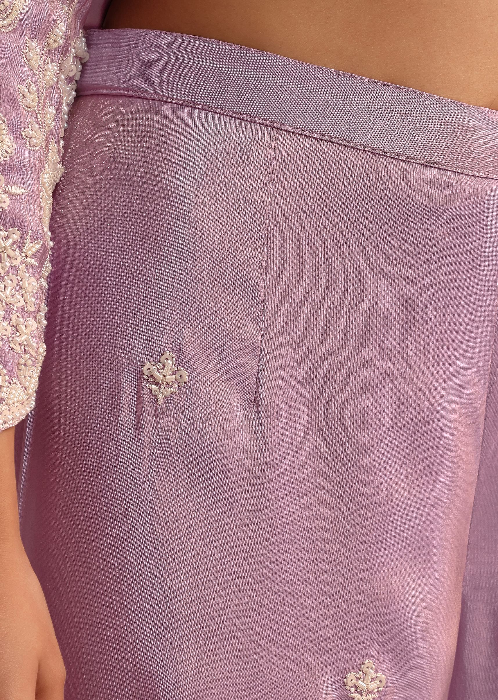 The purple hue adorned with intricate embroidery, sequins, and sparkling beads. The kurti dances with full moti, and resham work and detailed butti work on the sharara is a dream... More Product Details
