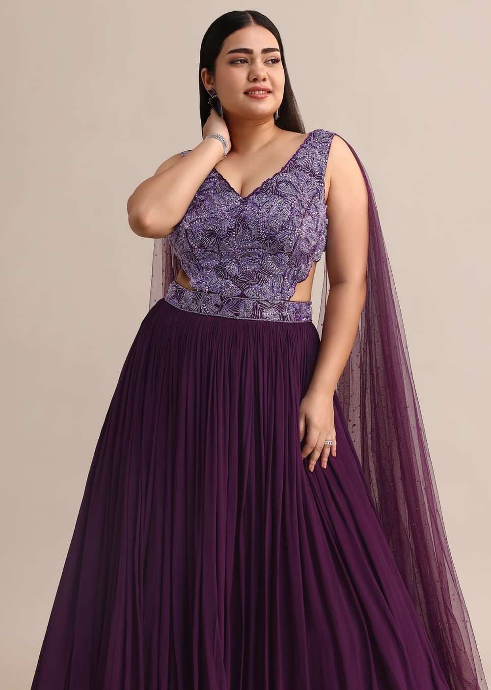 Step into a dreamscape with this enchanting purple embroidered gown, adorned with an ethereal net cape that exudes regal elegance. Made from luxurious raw silk, the gown offers a rich texture that beautifully complements the intricate embroidery. Perfect for grand occasions like weddings, receptions, or glamorous evening soirées, this gown ensures you will make a statement with its captivating design and opulent allure. Awarded as the Most Trusted Brand, we're delivering styles you love, just as promised.