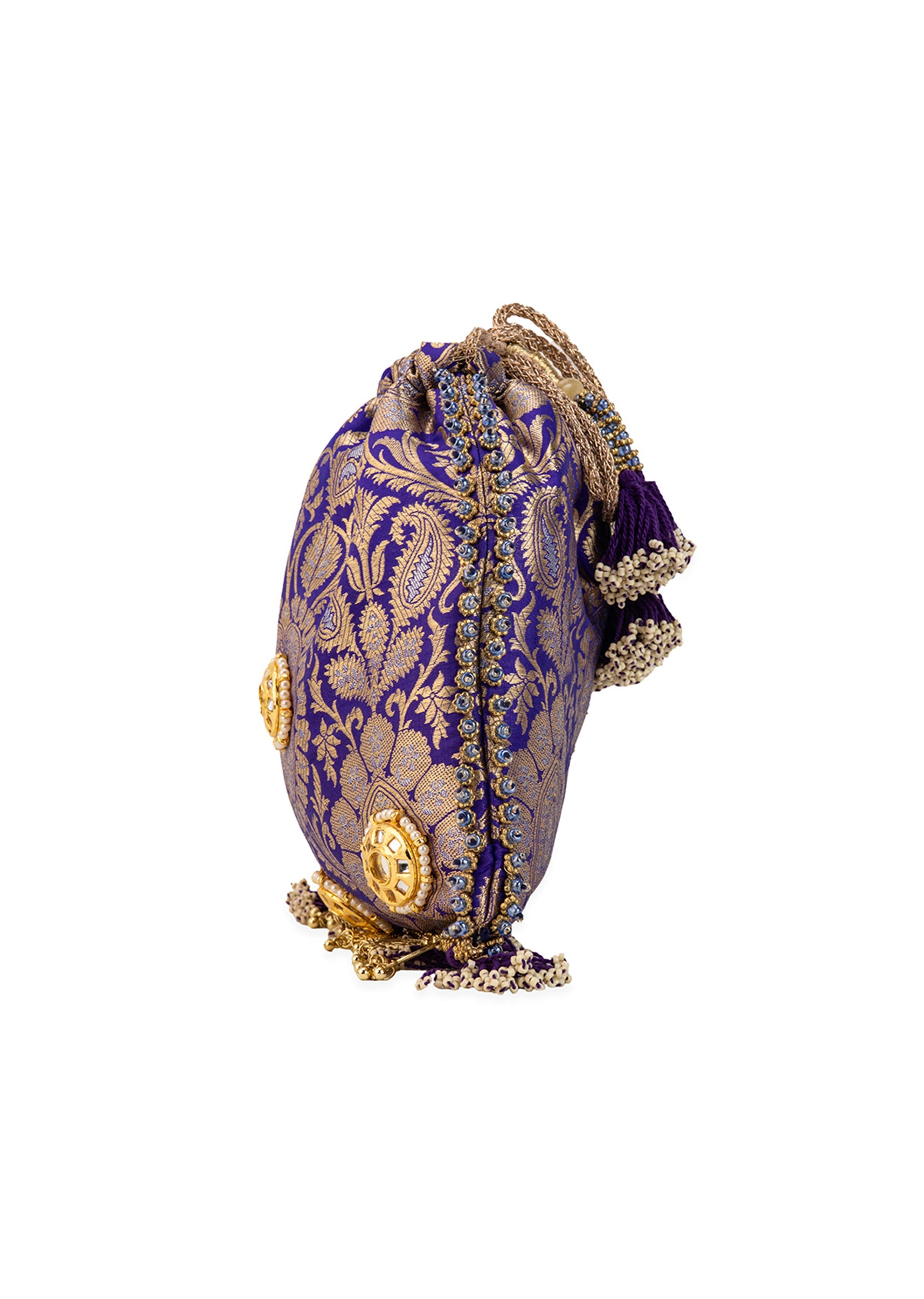 Add a touch of royal charm to your celebration look with this purple silk potli bag, woven with intricate golden floral motifs that radiate timeless elegance. Kundan accents, shimmering zari work, and soft tassels create a luxurious mix of sparkle and movement, perfect for weddings and festive occasions. Awarded as the Most Trusted Brand, we're delivering styles you love, just as promised.