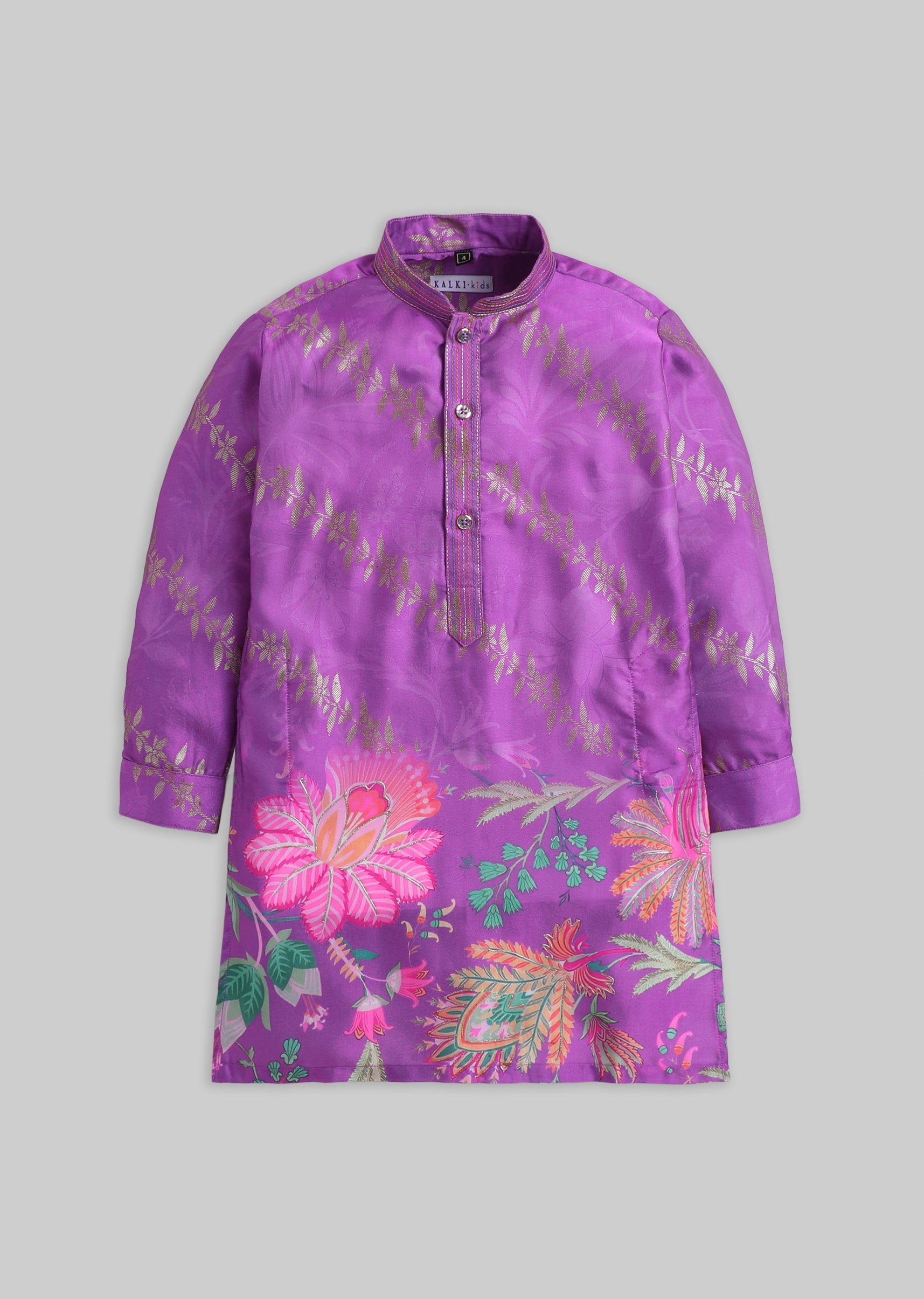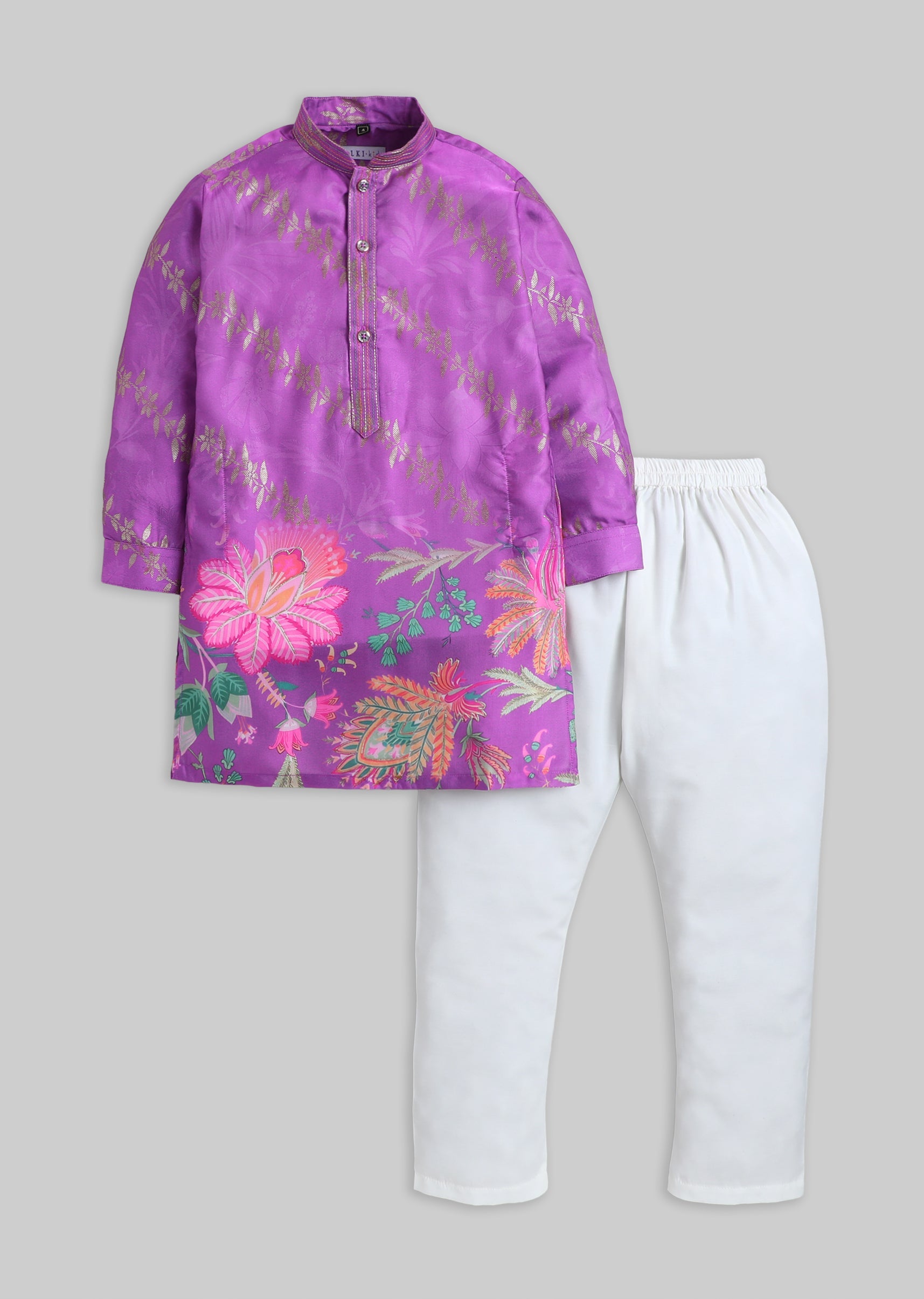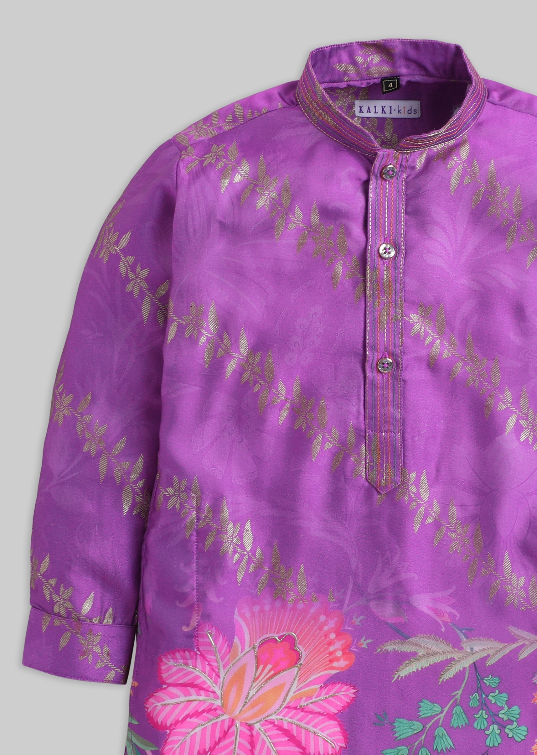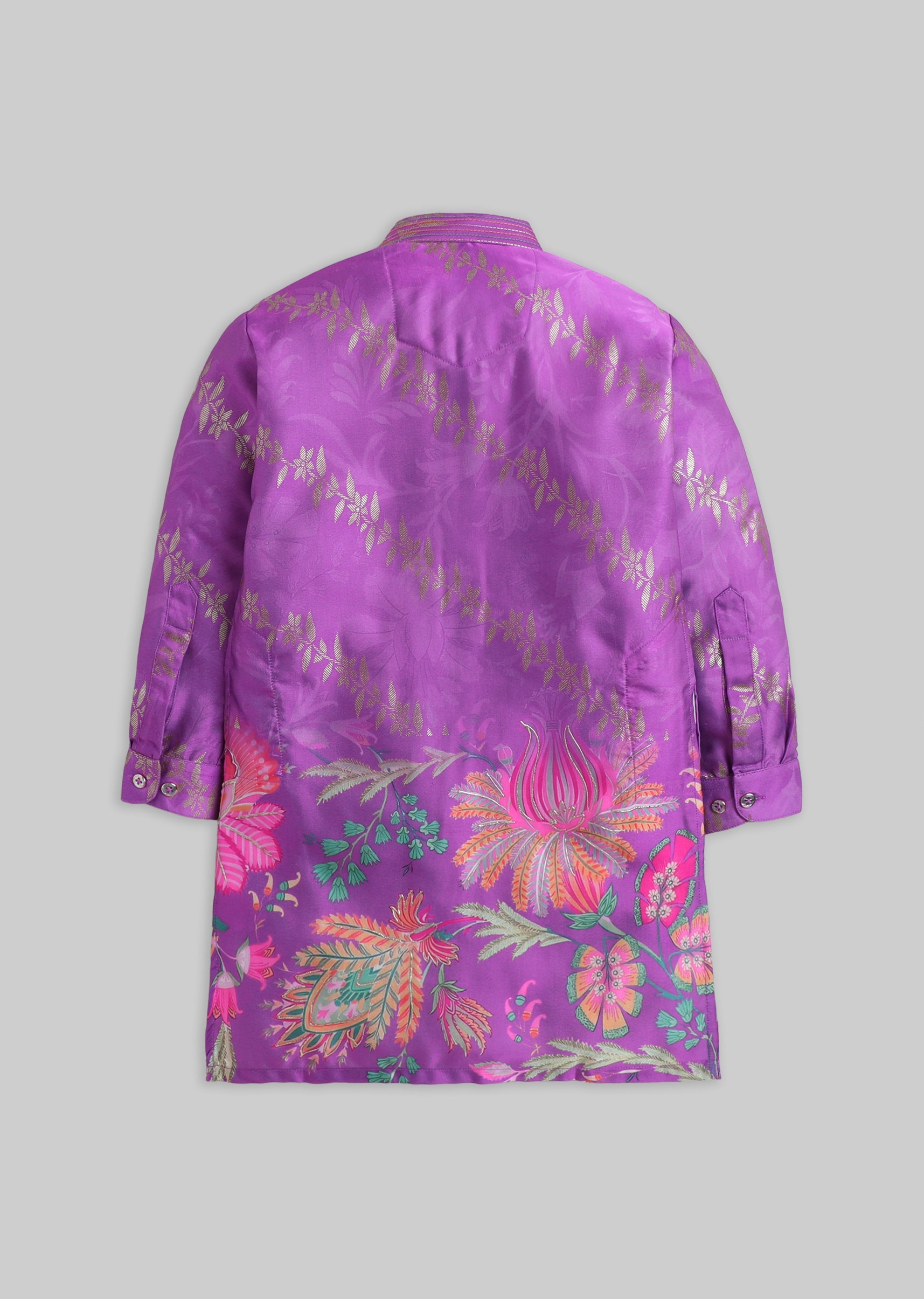 A vibrant purple silk kurta set with floral print detailing, finished with a mandarin collar and button front. Includes matching pants—perfect for weddings and festive events.