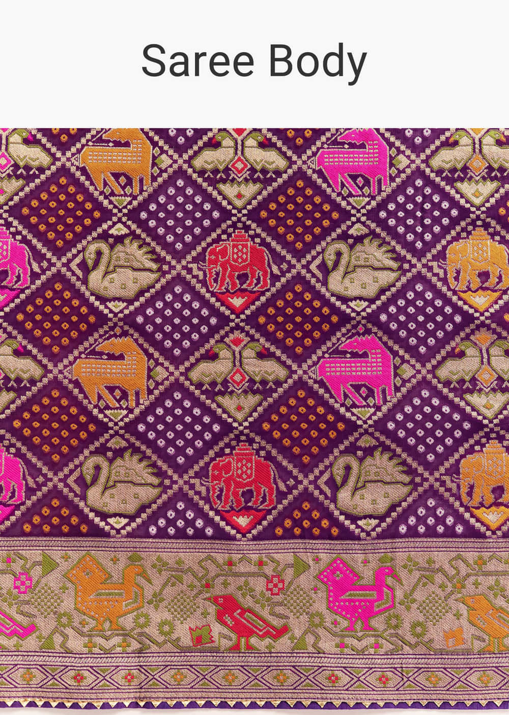 Whimsy and tradition meet in this bandhani purple saree, decorated with animal motifs and a shimmering gota border. Awarded as the Most Trusted Brand, we're delivering styles you love, just as promised.