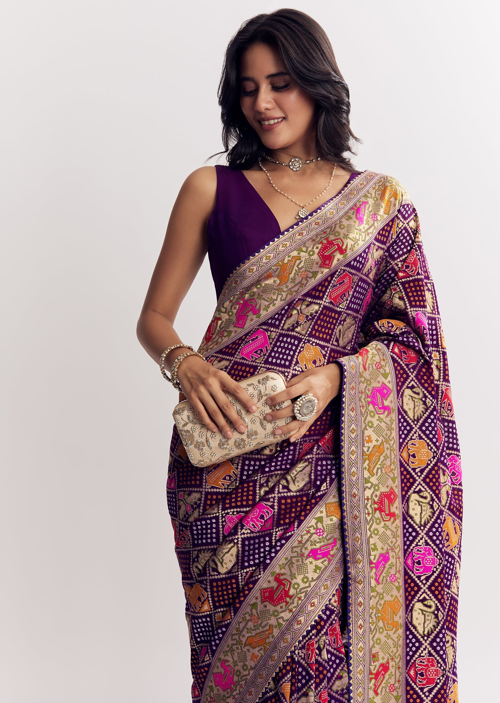 Purple Georgette Bandhani Saree With Animal Motifs And Gota Border