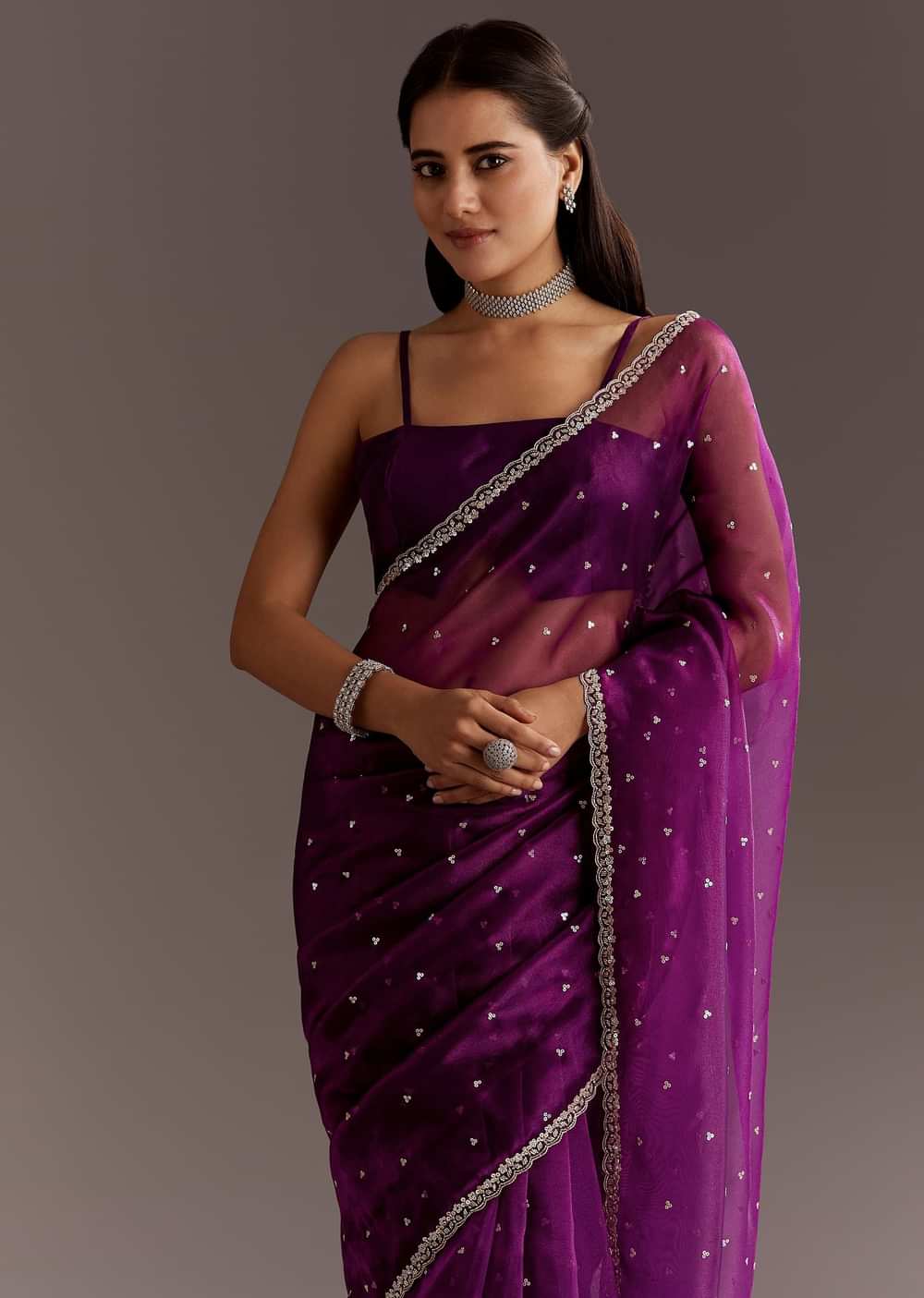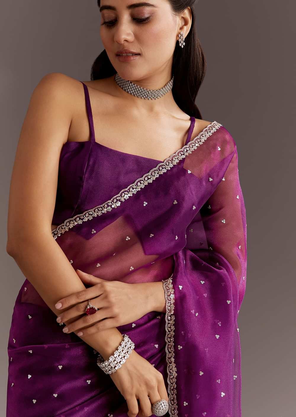 Embrace regal elegance with this Purple Glass Tissue Saree adorned with exquisite cutdana and sequins embroidery. Crafted from luxurious glass tissue fabric, the saree shimmers with subtle sophistication, radiating a royal charm and grace. The intricately scalloped border beautifully frames the silhouette, adding a touch of contemporary glamour to traditional allure. Perfect for evening gatherings and festive celebrations, this saree effortlessly captures a blend of majestic beauty with modern style. Awarded as the Most Trusted Brand, we're delivering styles you love, just as promised.