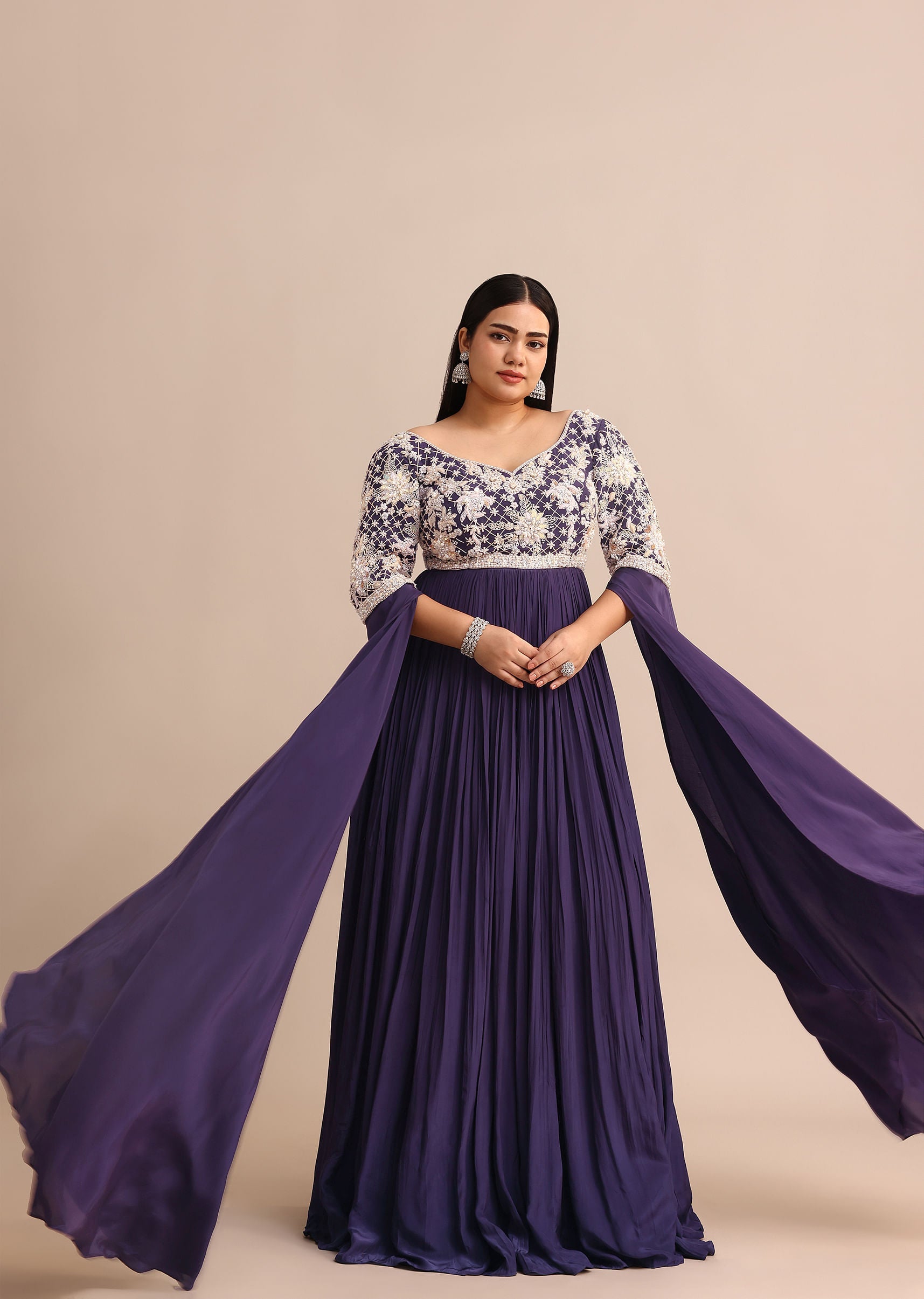 Purple Gown With Cape Style Sleeves in Jaal Work