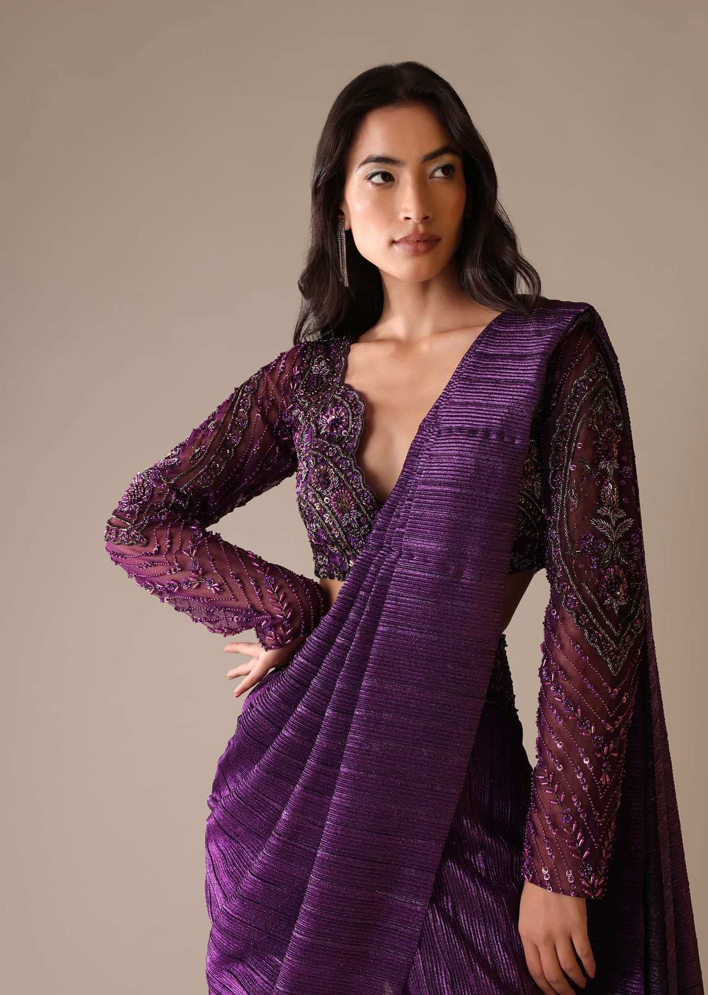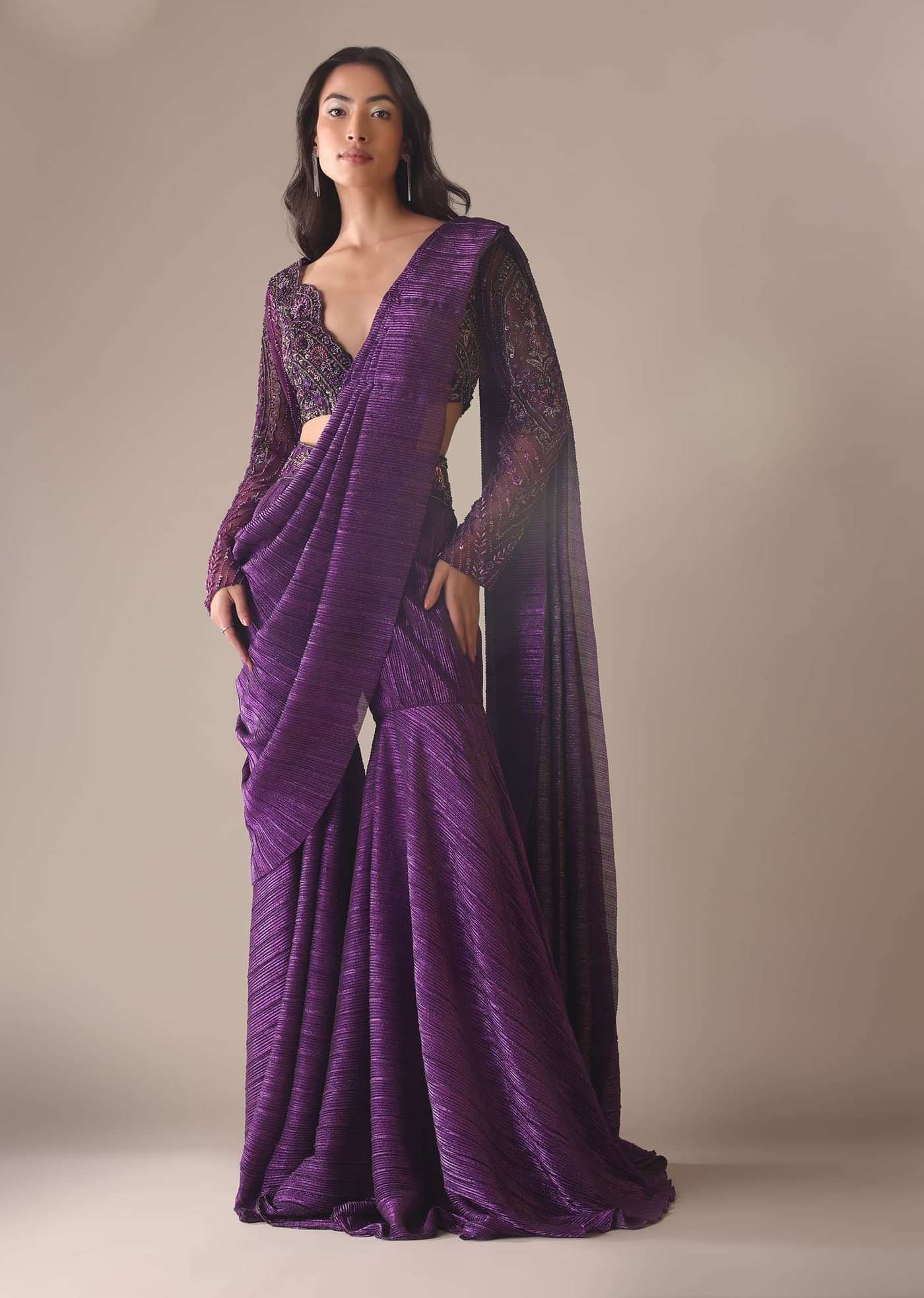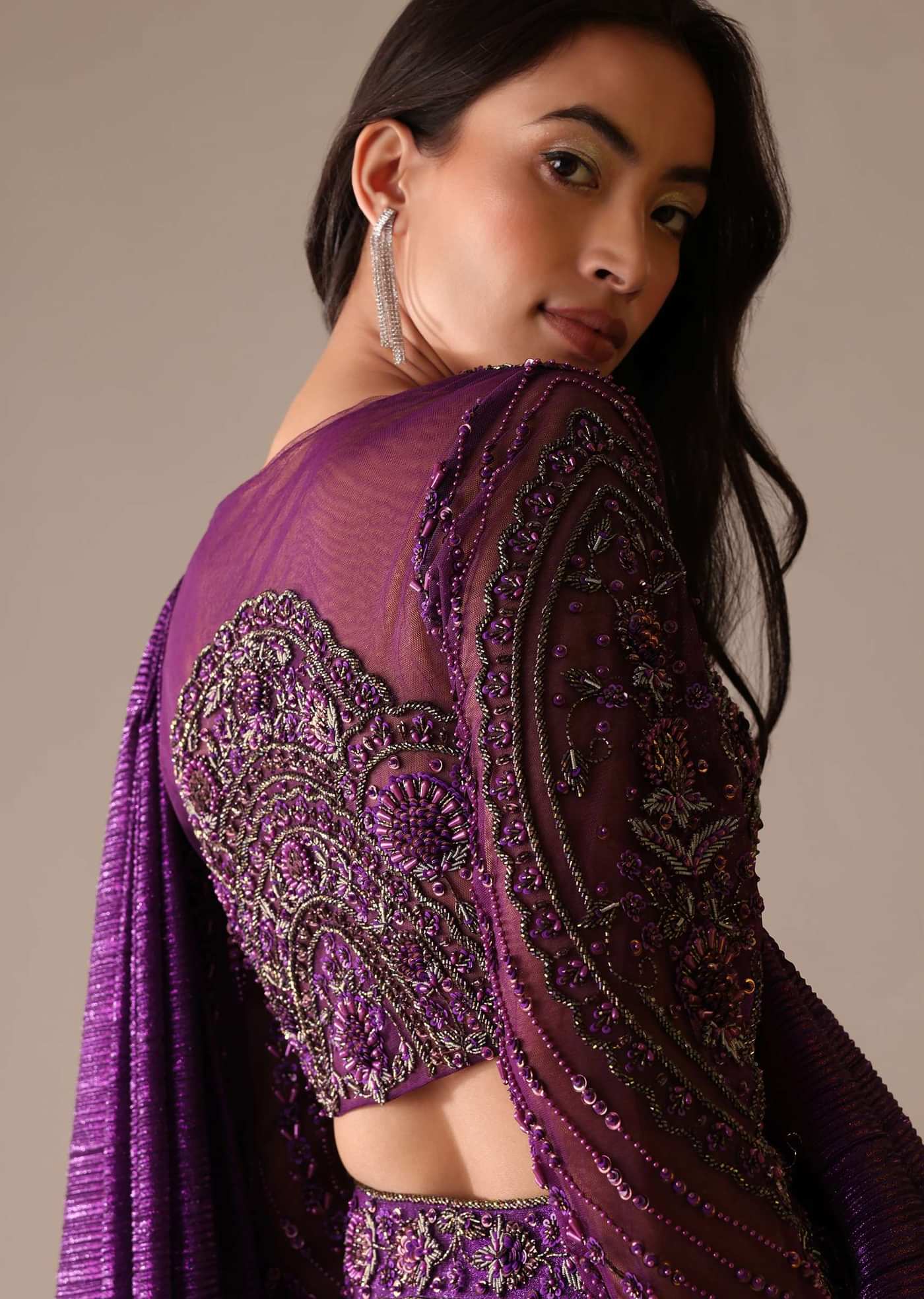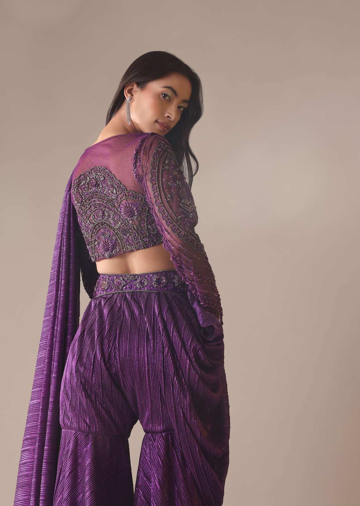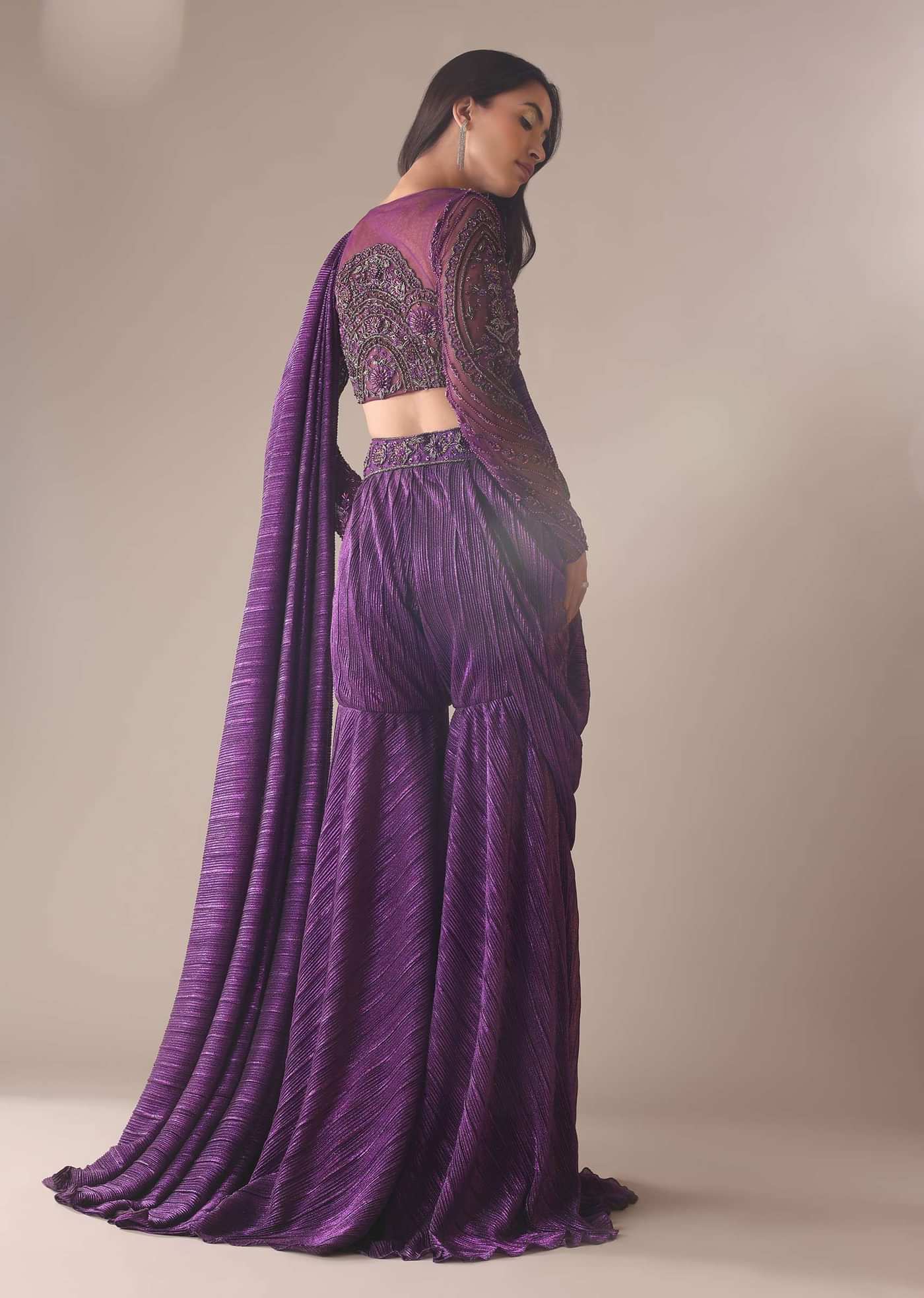 Purple Hand Embroidered Sharara And Blouse Set In Crushed Shimmer