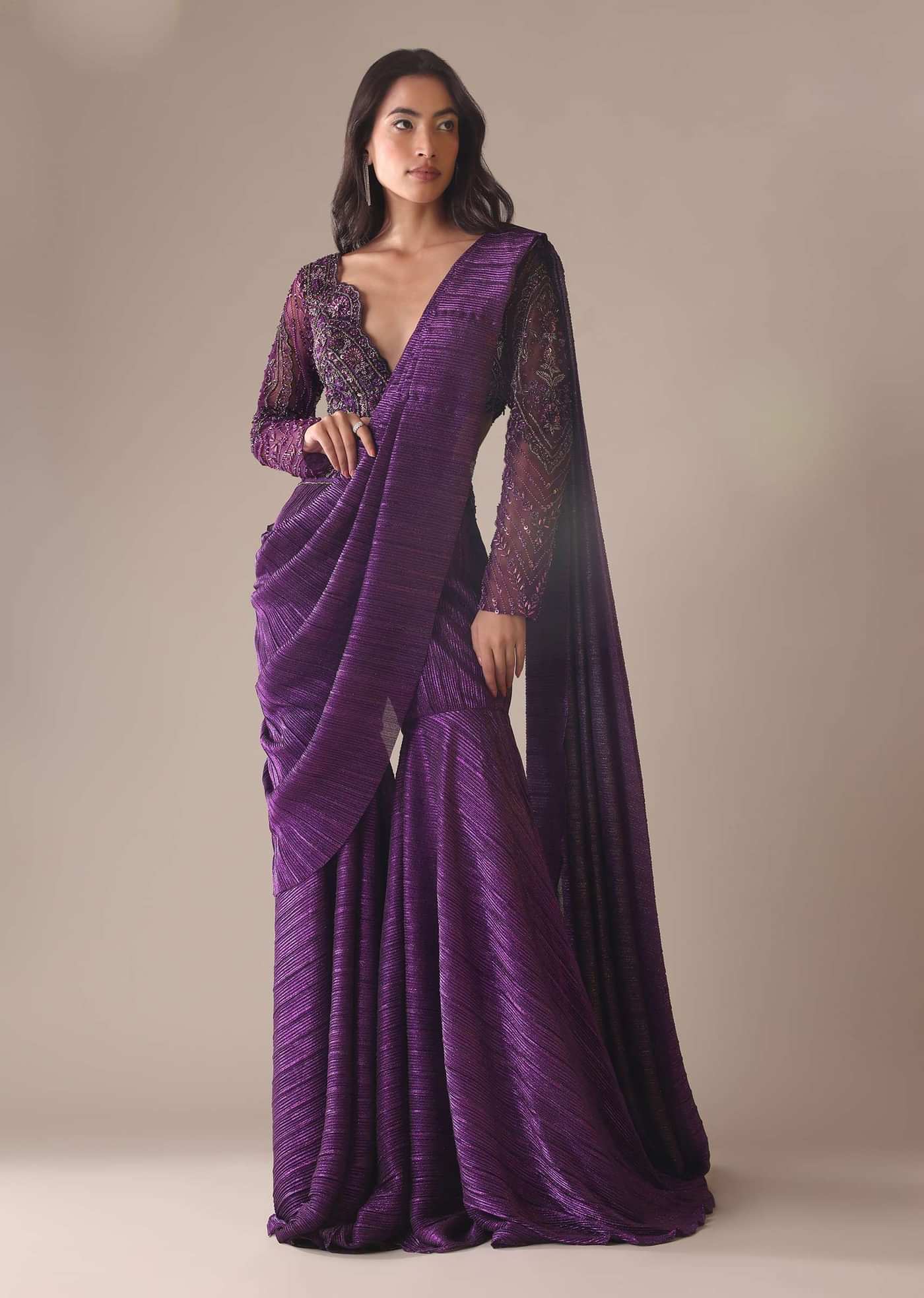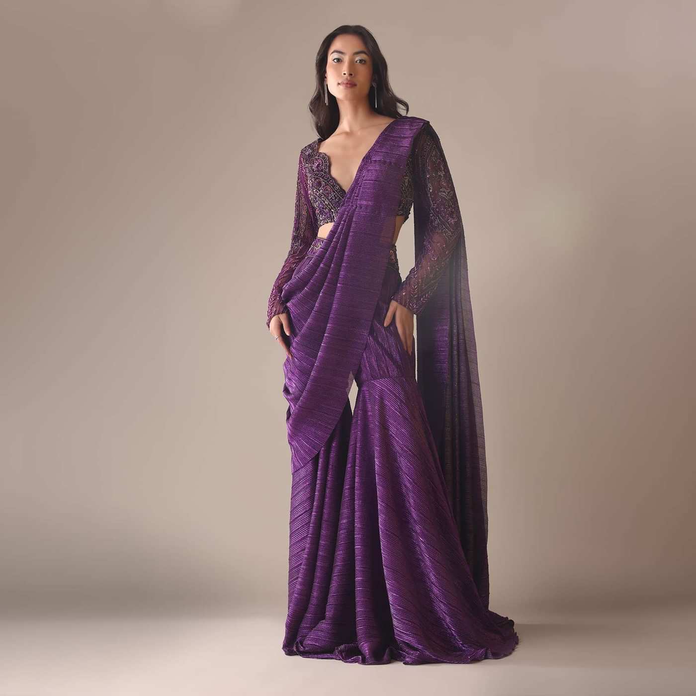 Step into a world of opulence and allure with our luxurious purple-embroidered sharara set in chrushed shimmer. Adorned with intricate handwork in stones, sequins, and beads, this set exudes a... More Product Details