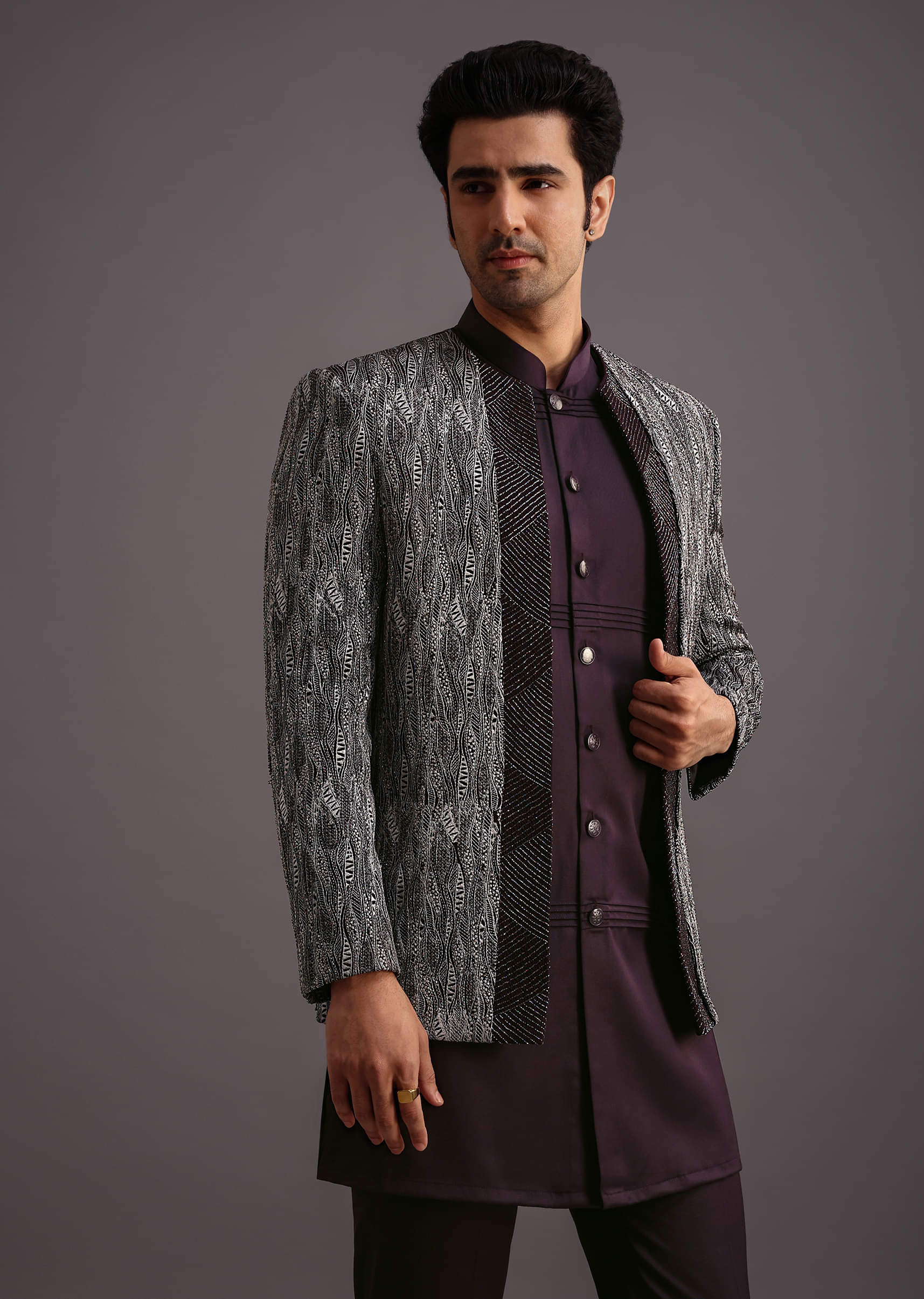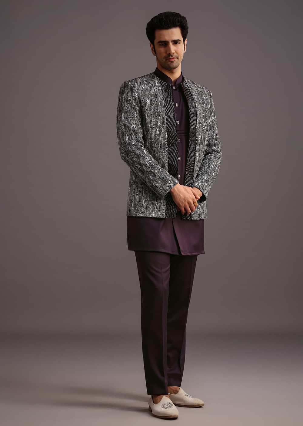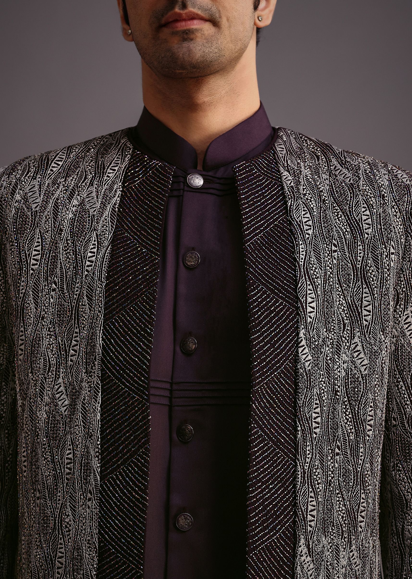 Pair this Purple Hand Work Jacket Kurta Set with classic tan or embroidered juttis for a royal finish.