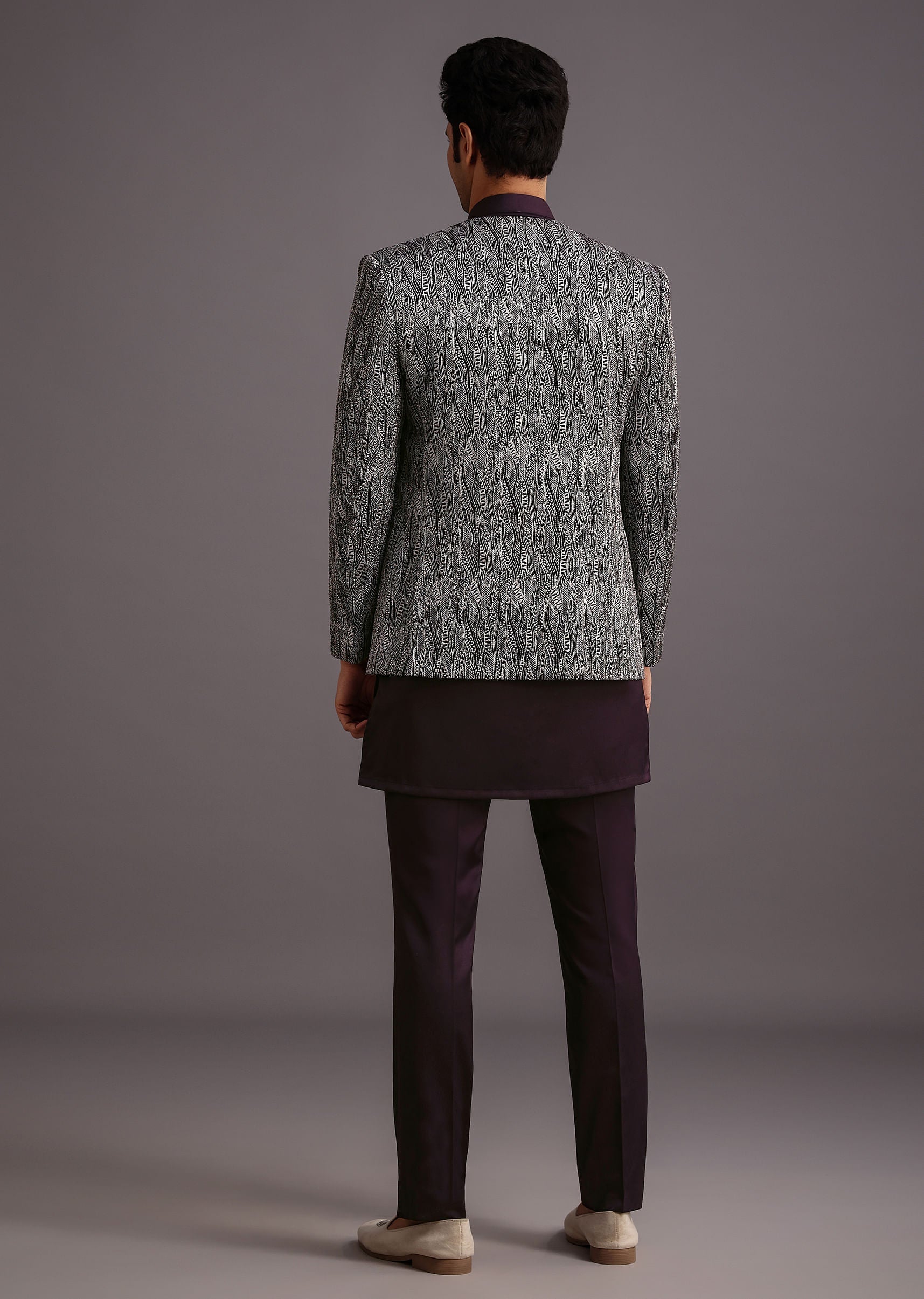 Make a bold style statement with this Purple Hand Work Jacket Kurta Set featuring a sophisticated mandarin collar. The intricate handwork detailing on the jacket adds a regal touch perfect... More Product Details