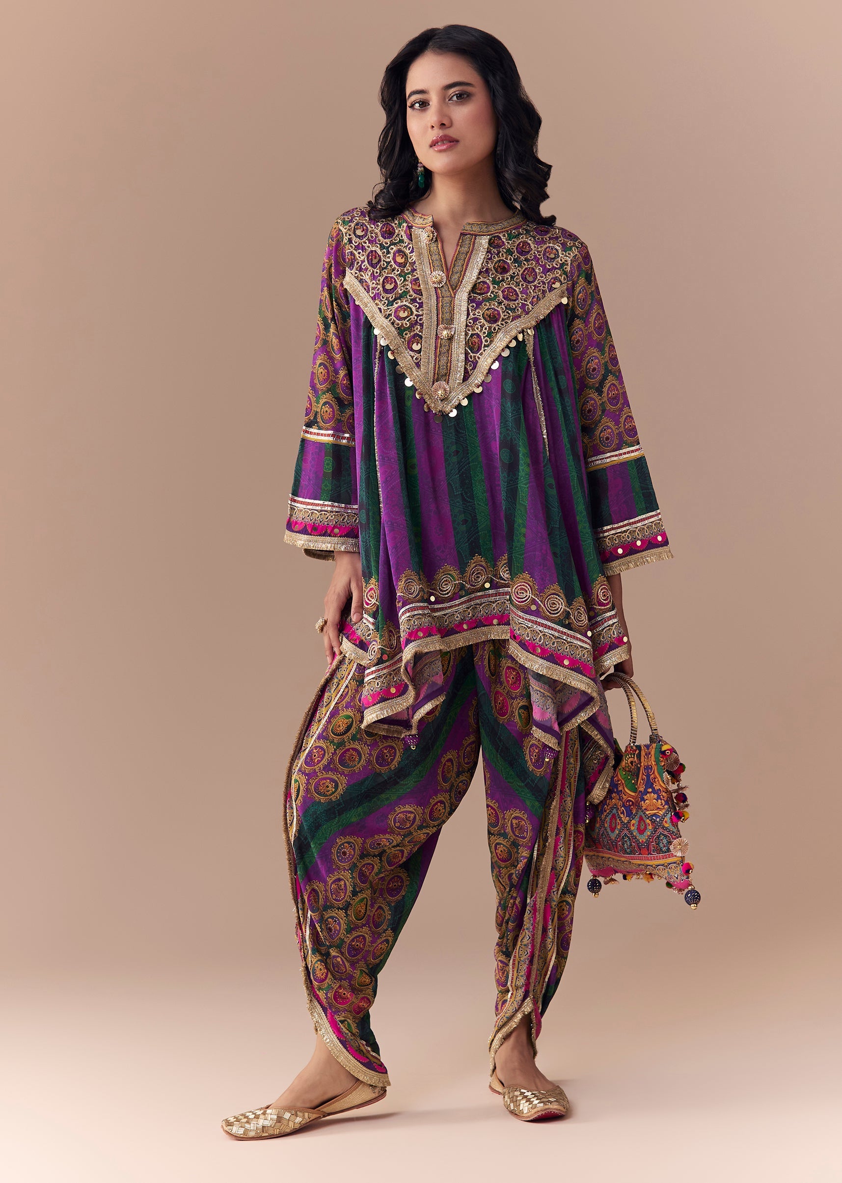 This indie-inspired ensemble features a printed kurta with intricate gotta lace work paired with a classic dhoti silhouette, creating a festive yet contemporary charm. Crafted in rich purple crepe, it... More Product Details