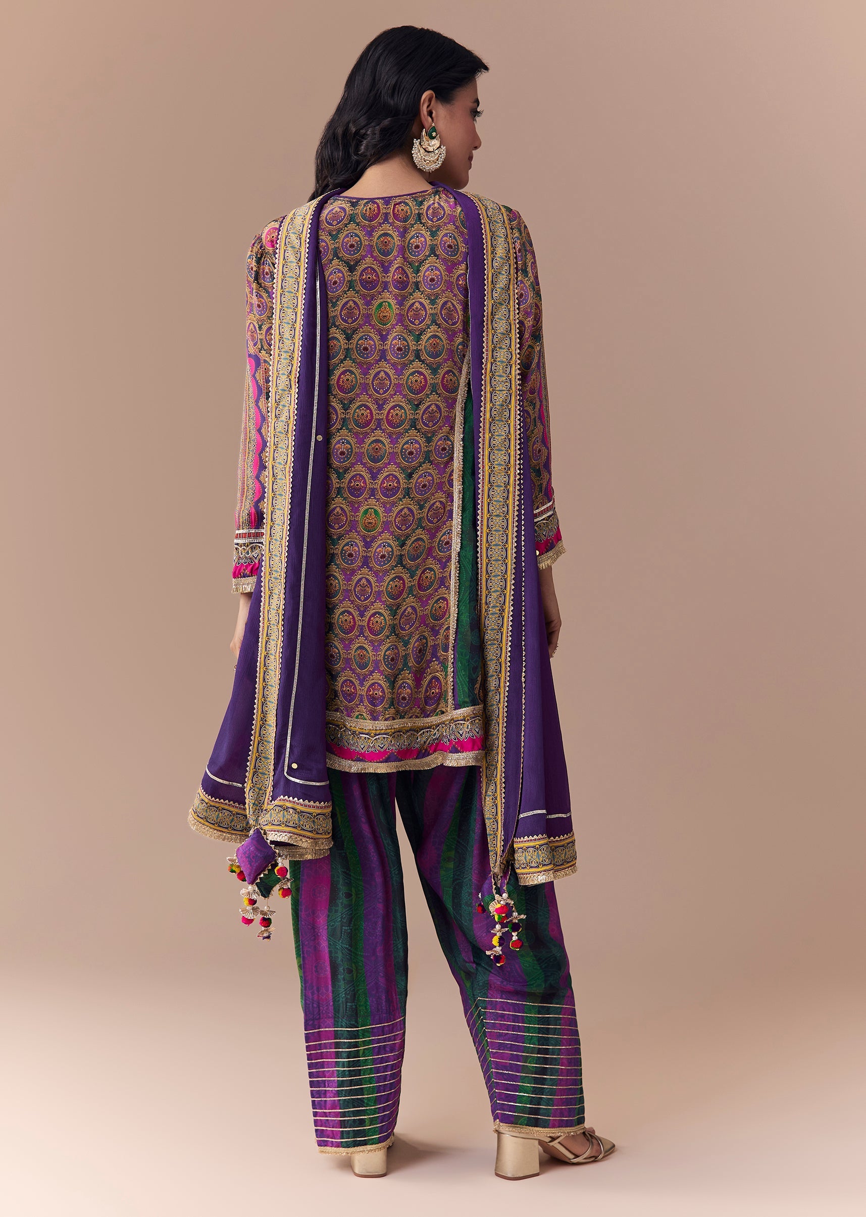 Purple Indie Print Kurti Patiala Suit Set with Handbag