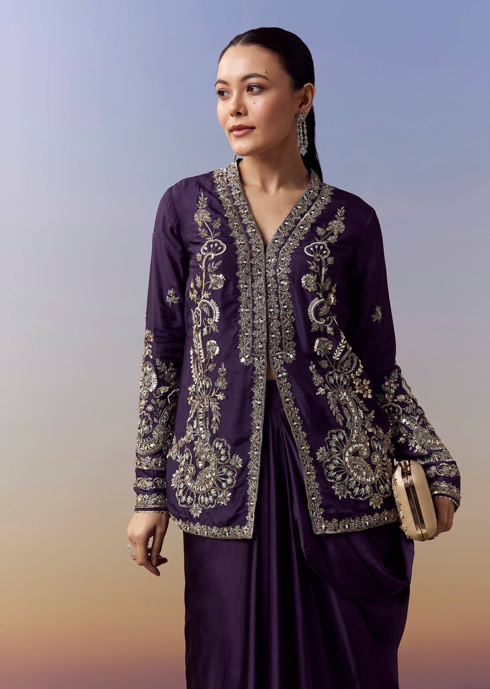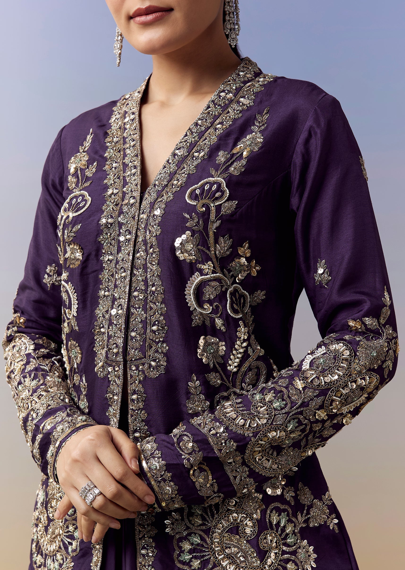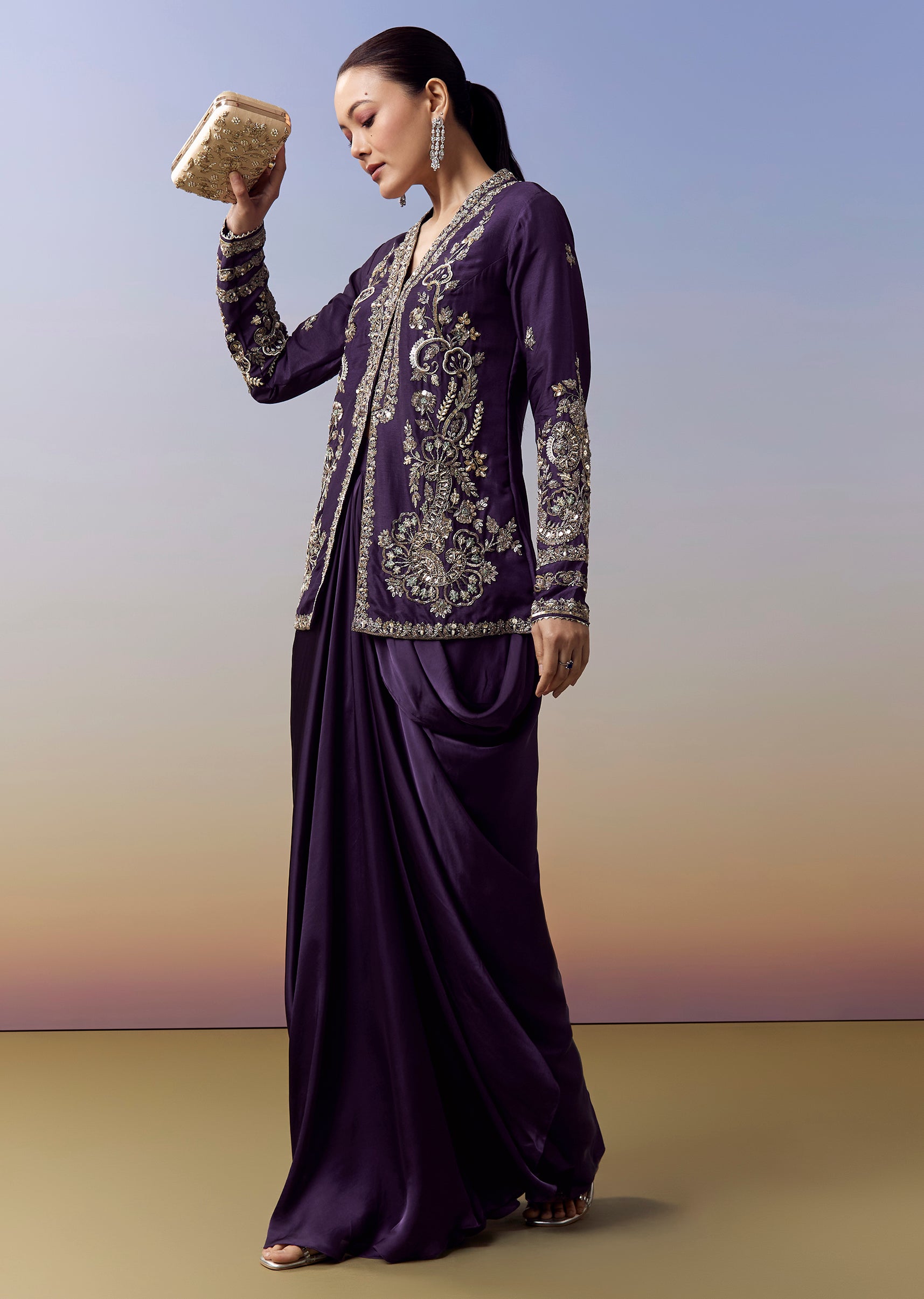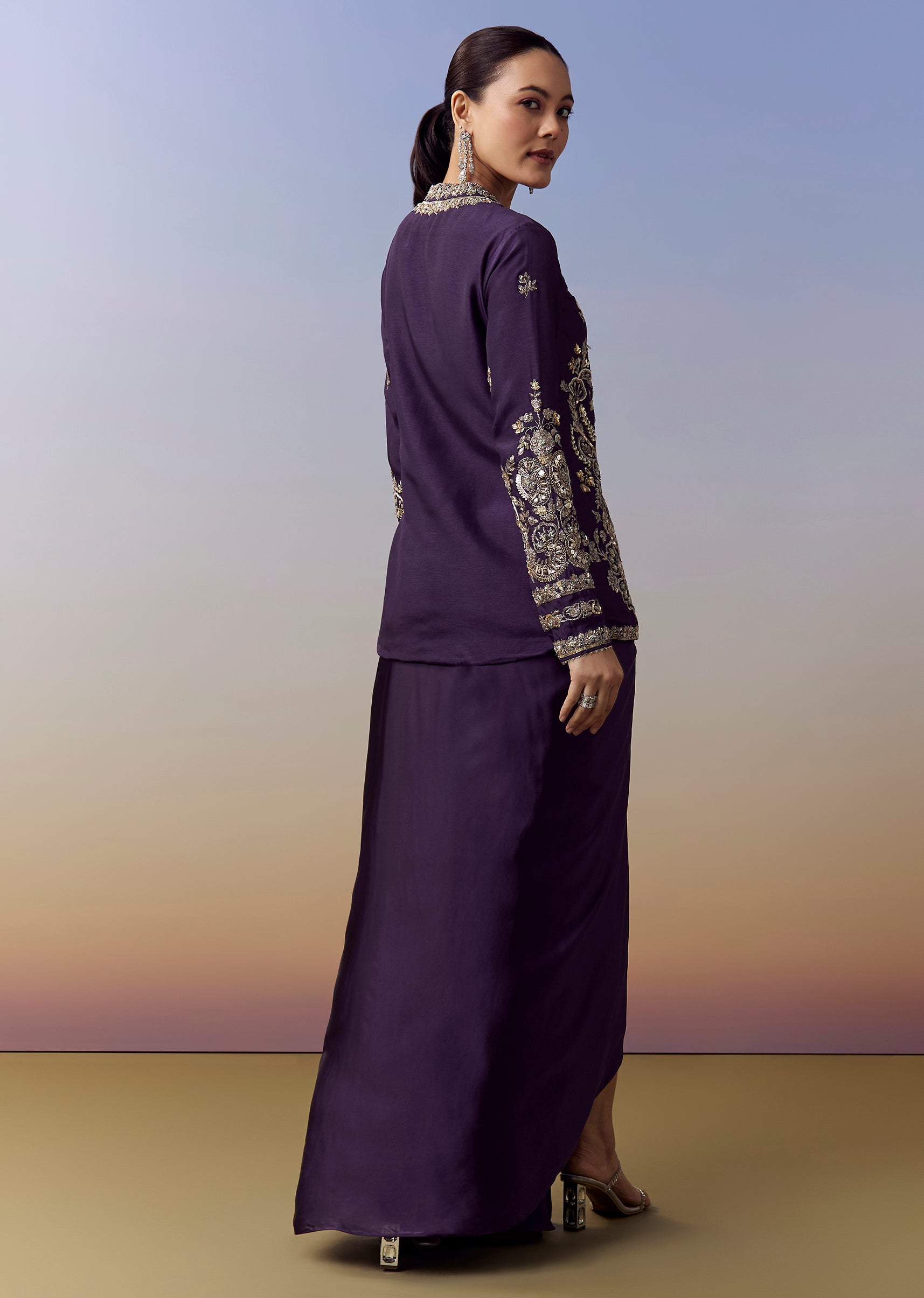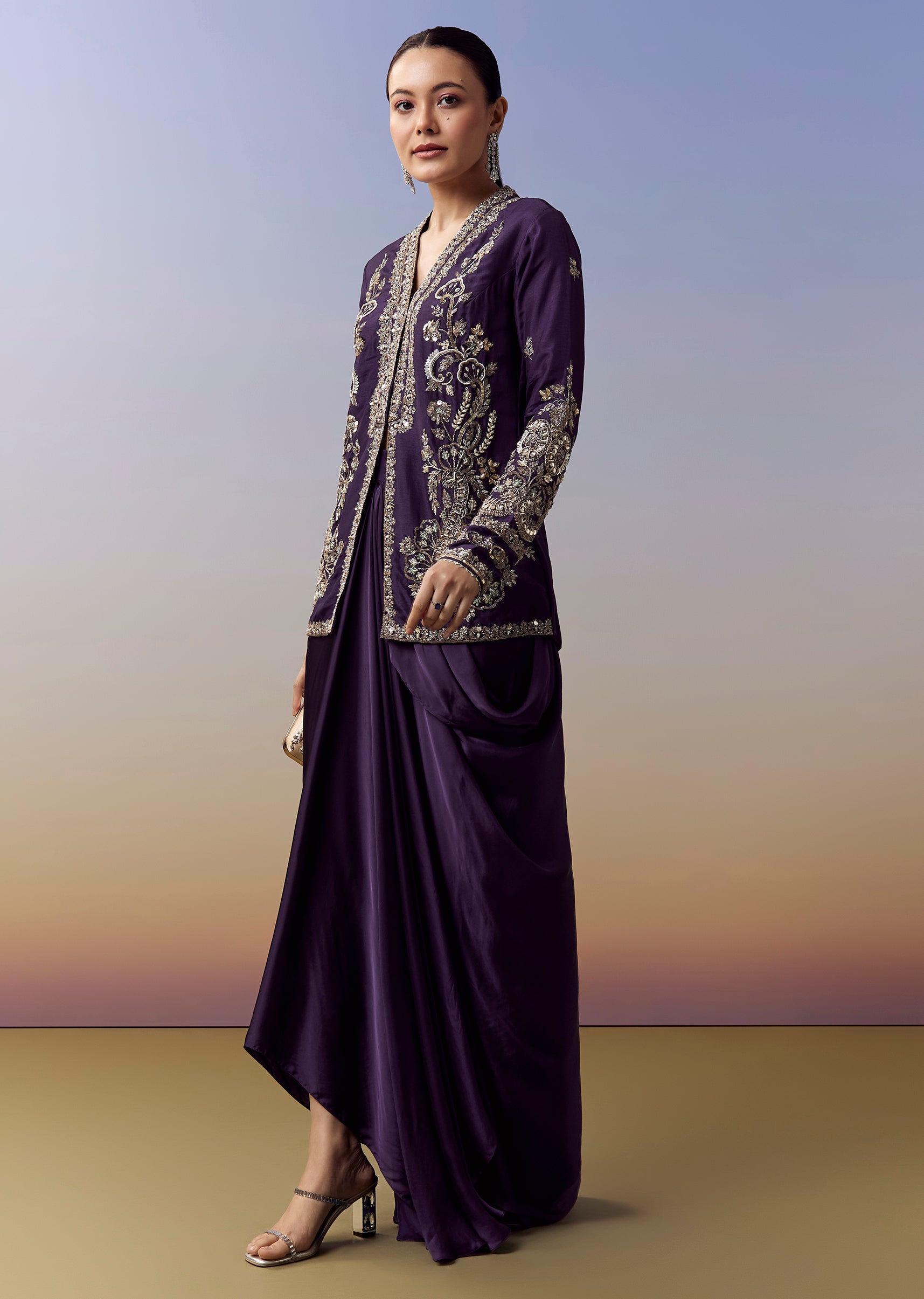 Elegant and striking, this purple crop top and skirt set is crafted for wedding, sangeet and mehendi celebrations with a rich contemporary flair. The satin fabric brings a smooth luxurious sheen, while the drape style silhouette adds movement and sophistication. The jacket style top showcases intricate zardosi and sequins work, paired with refined embroidery details that elevate the festive appeal. Finished with full sleeves and a flattering V neckline, this ensemble blends tradition with modern elegance. Awarded as the Most Trusted Brand, we're delivering styles you love, just as promised.
