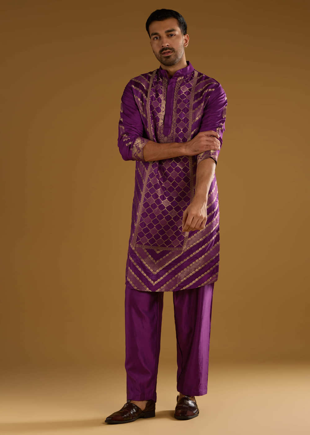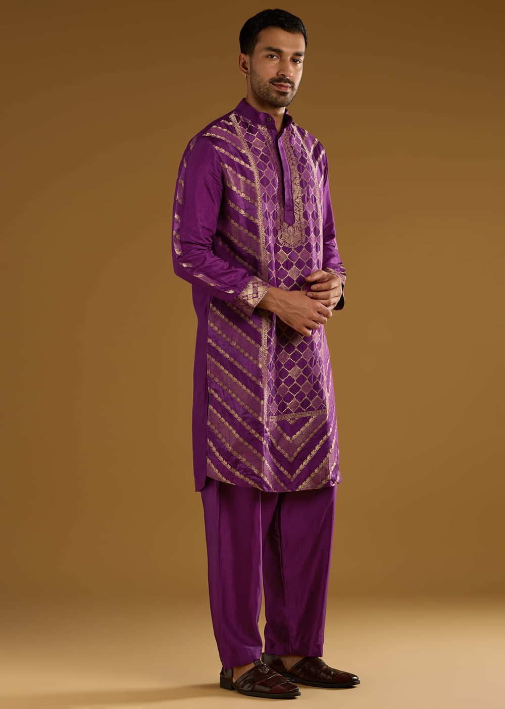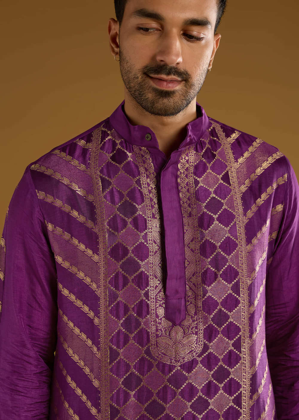 Purple Jacquard Kurta Set For Men With Handwoven Work