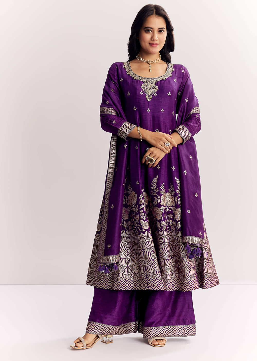 Purple Jacquard Silk Anarkali Dupatta Suit With Traditional Weave