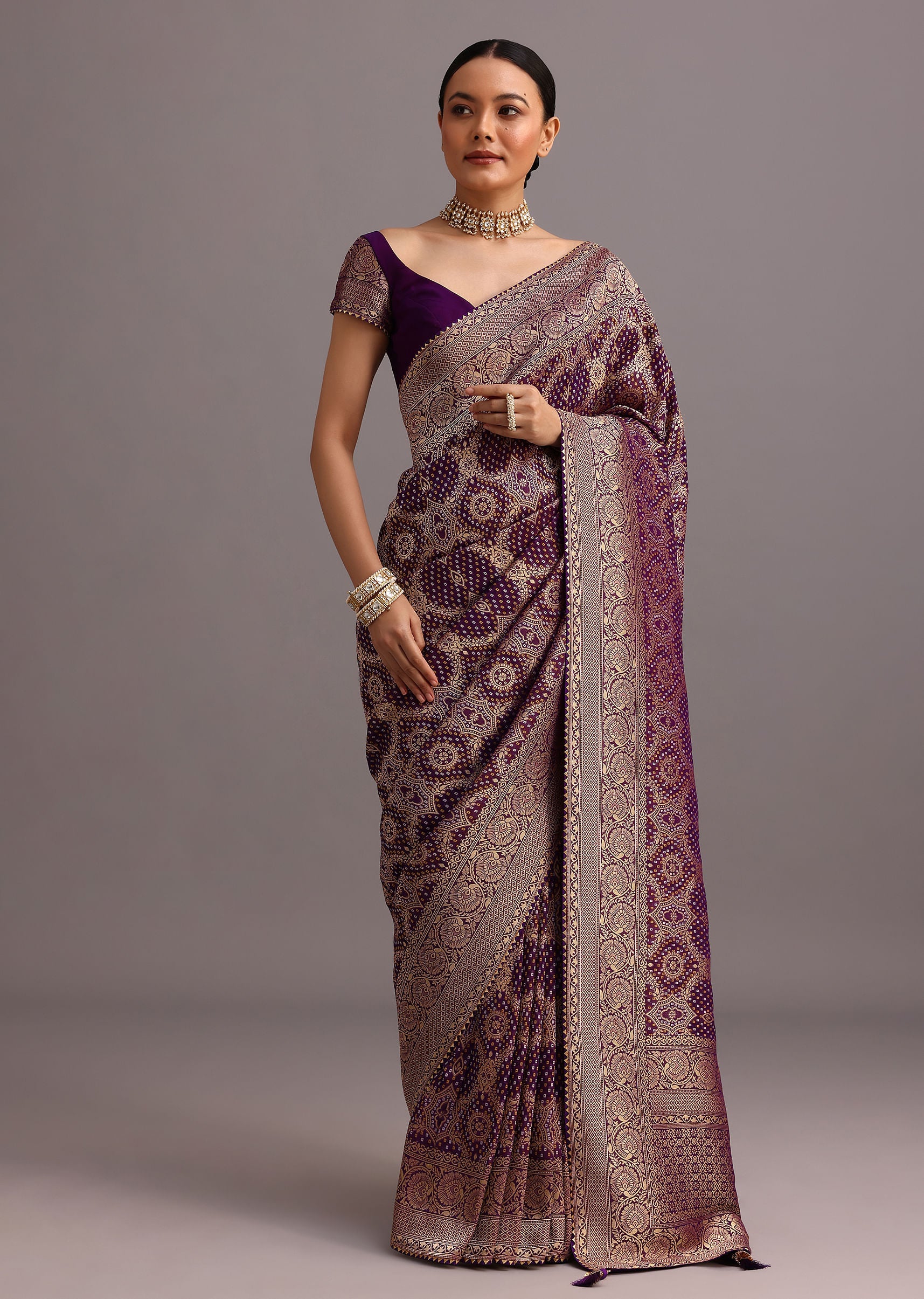 Purple Khaddi Georgette Woven Saree In Bandhani Detail With Gotta Patti Border