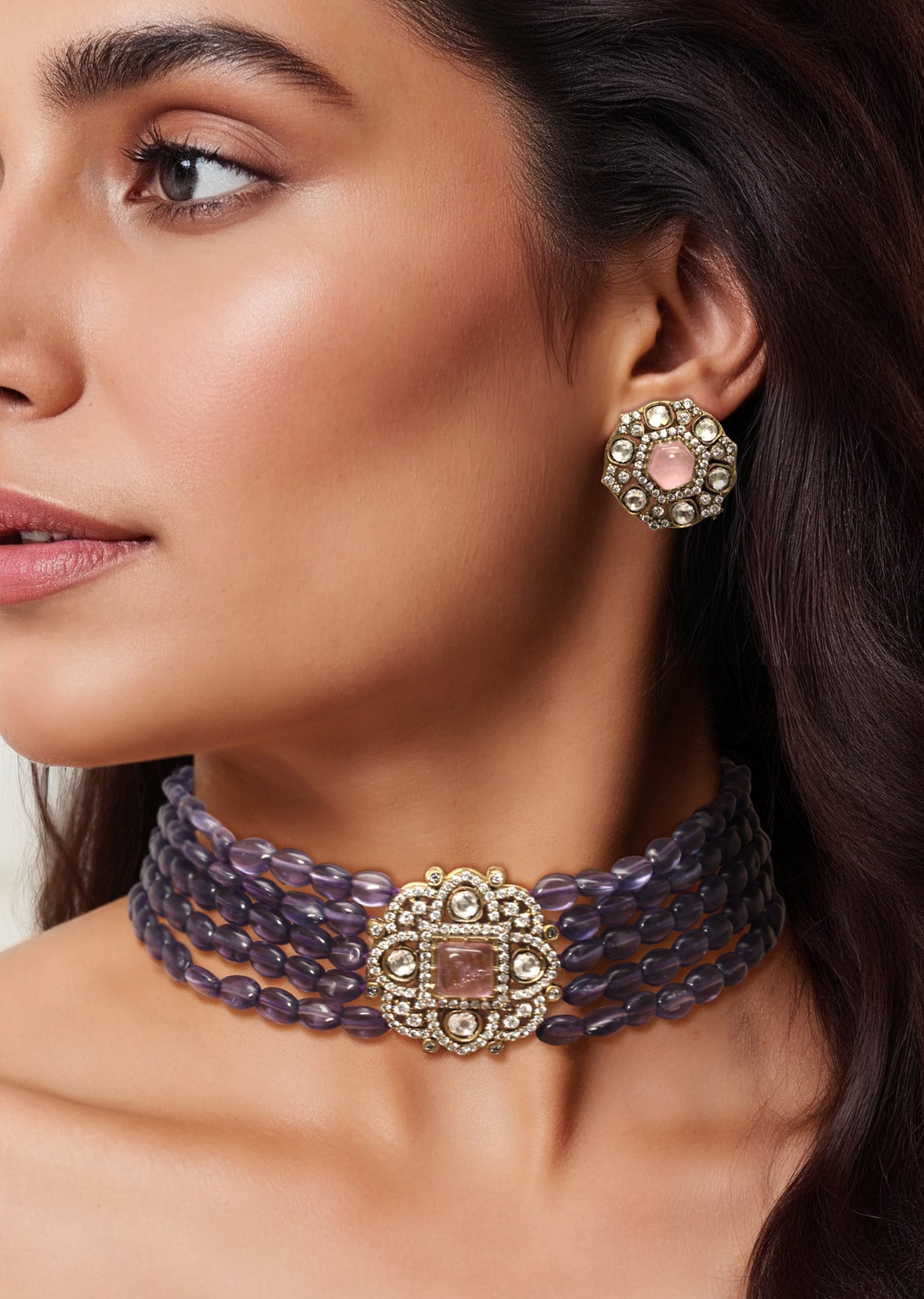 Purple Kundan Layered Necklace and Earring Set
