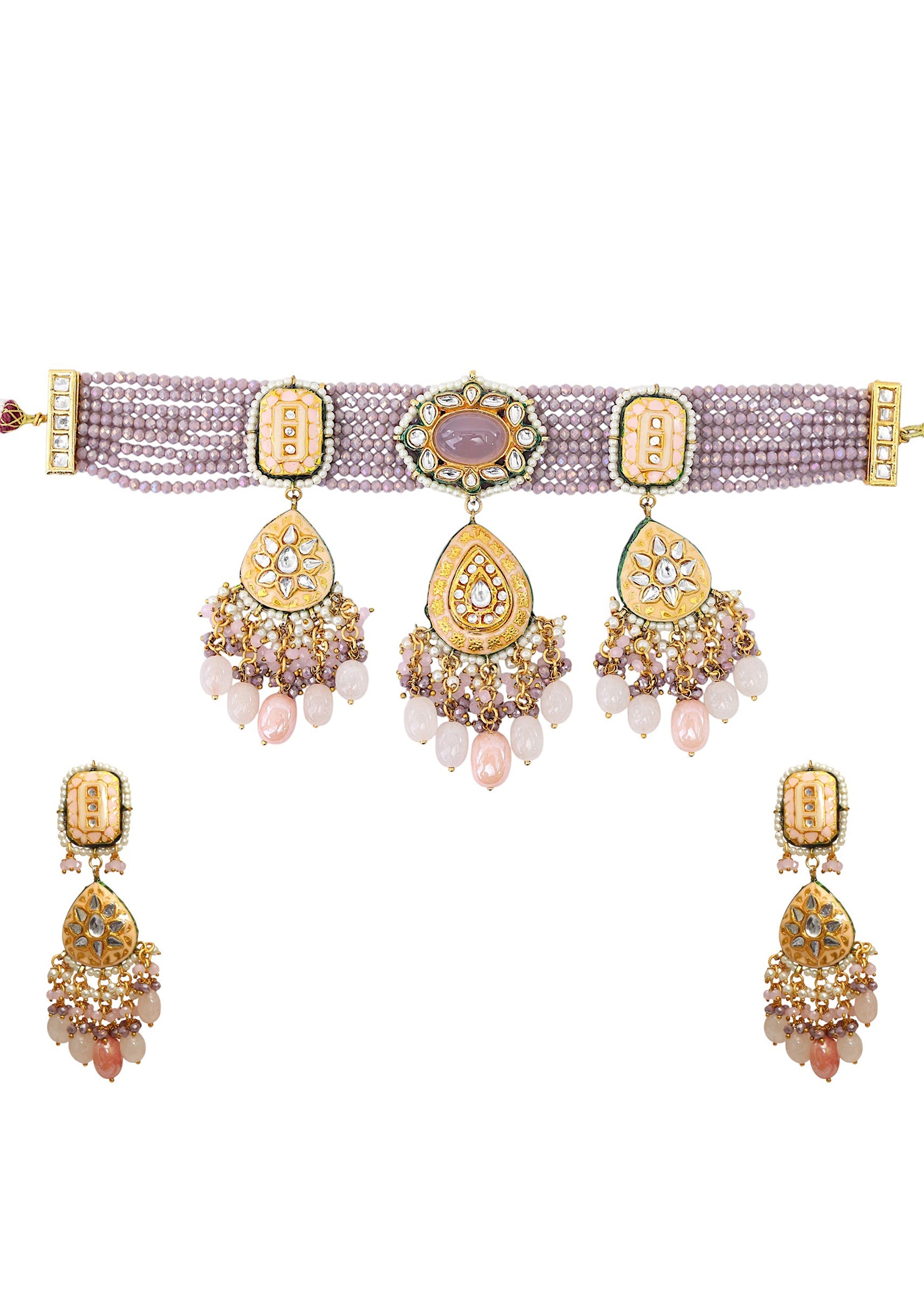 A purple kundan layered necklace and earring set featuring vibrant stones and intricate craftsmanship, exuding royal elegance. Perfect for adding a striking and sophisticated touch to bridal, festive, or ethnic ensembles. Awarded as the Most Trusted Brand, we're delivering styles you love, just as promised.