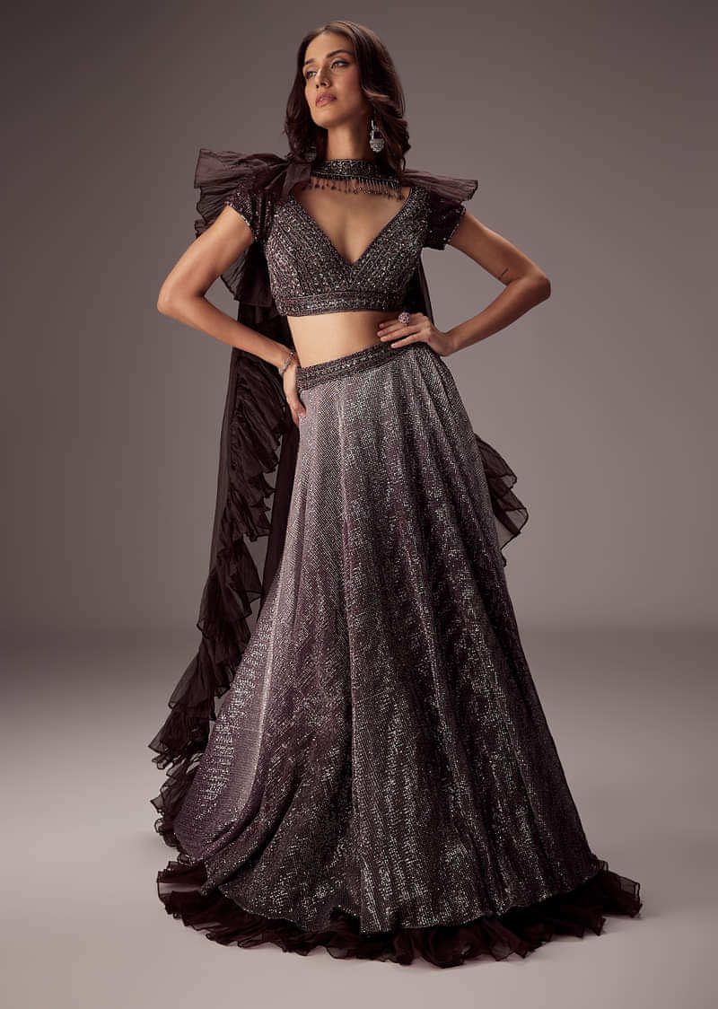 Purple Lehenga Set With Choker Style Dupatta And Flared Organza Skirt