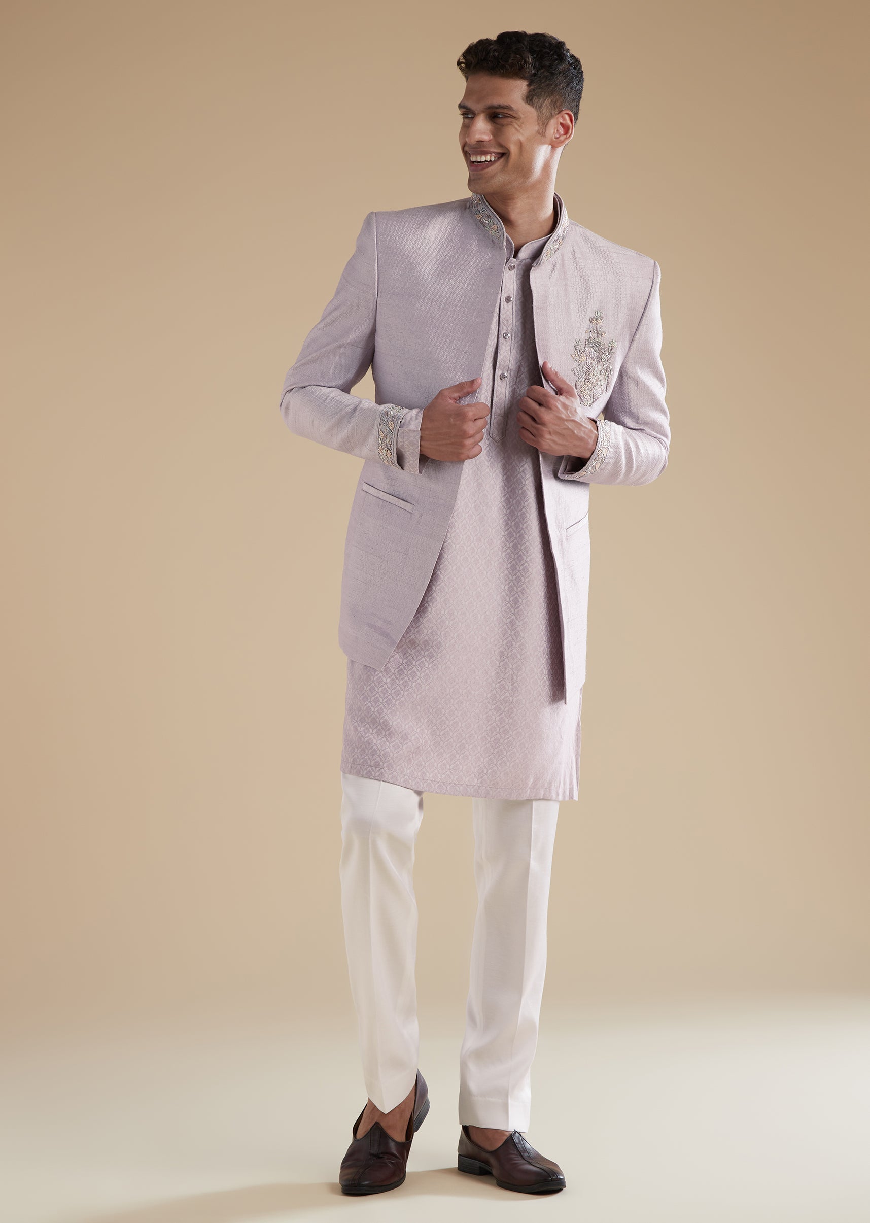 Designed for pastel themed festivities, this purple lilac indowestern is tailored in rich jacquard as the primary fabric with silk as the secondary for a refined and contemporary celebration look.... More Product Details