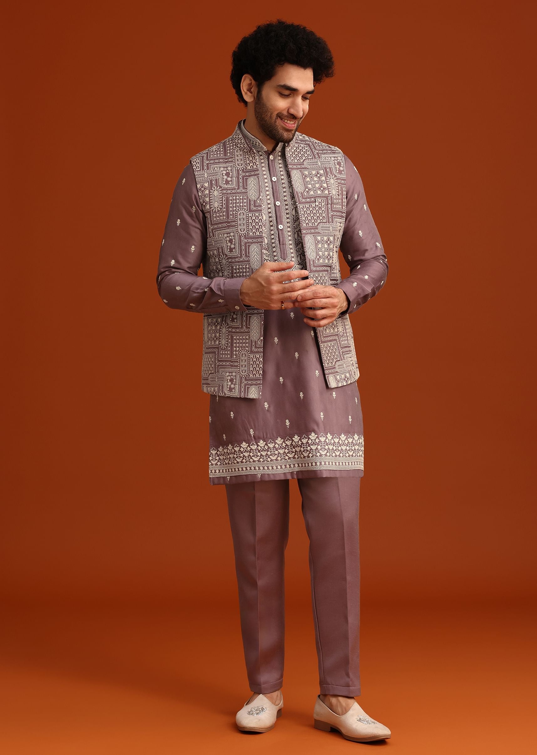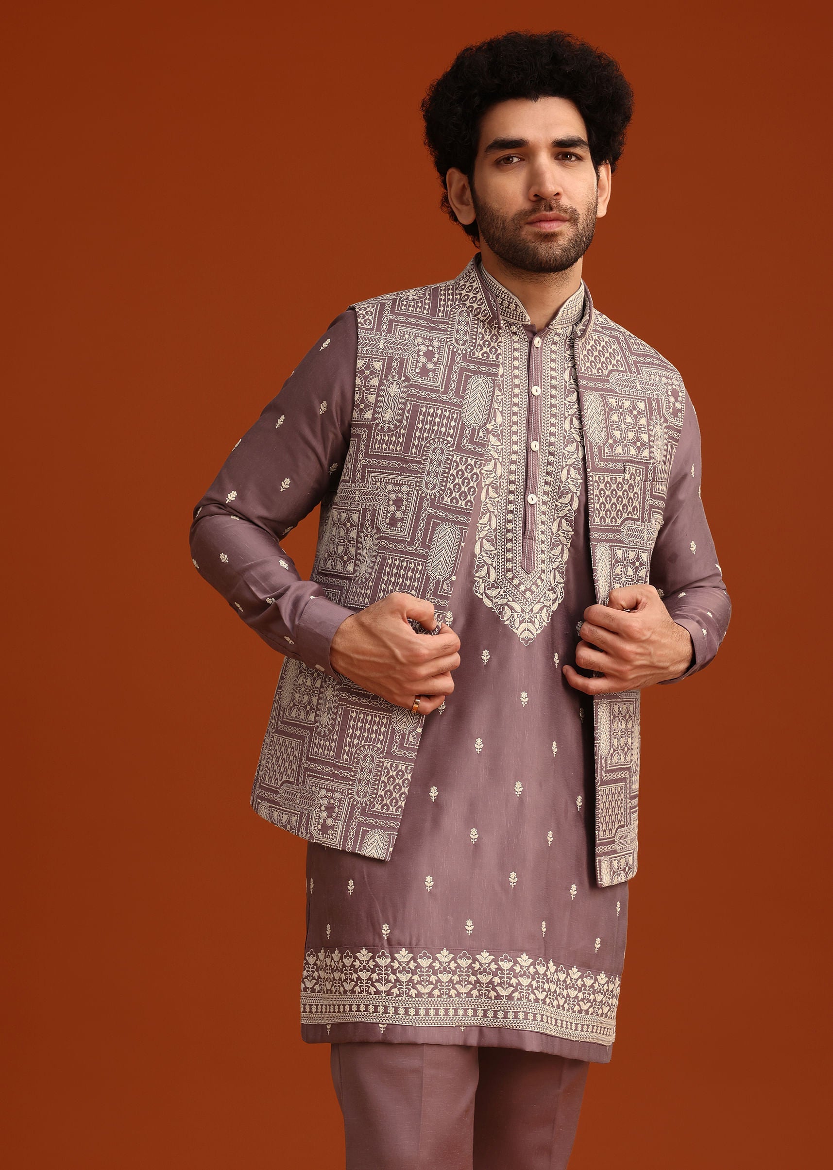 Purple Linen Satin Embroidered Jacket Kurta Set