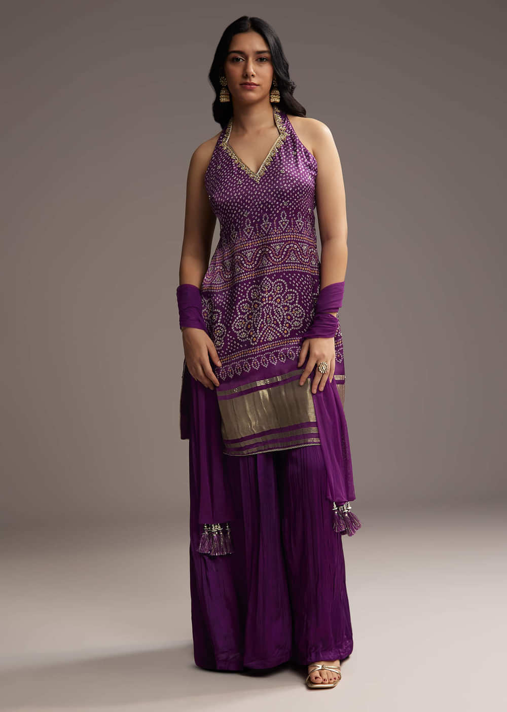 Purple Modal Satin Palazzo Suit With Bandhani Print