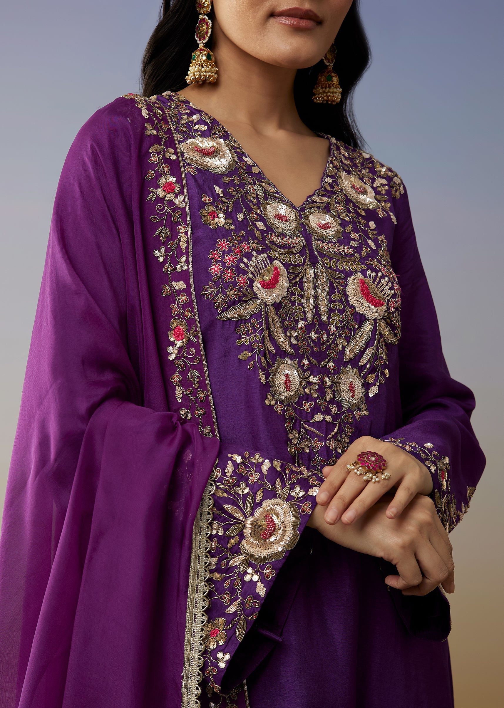 This purple palazzo suit brings a striking color pop with its ombre series design crafted for mehendi sangeet and wedding celebrations. The straight style kurta features intricate zardosi and sequins... More Product Details