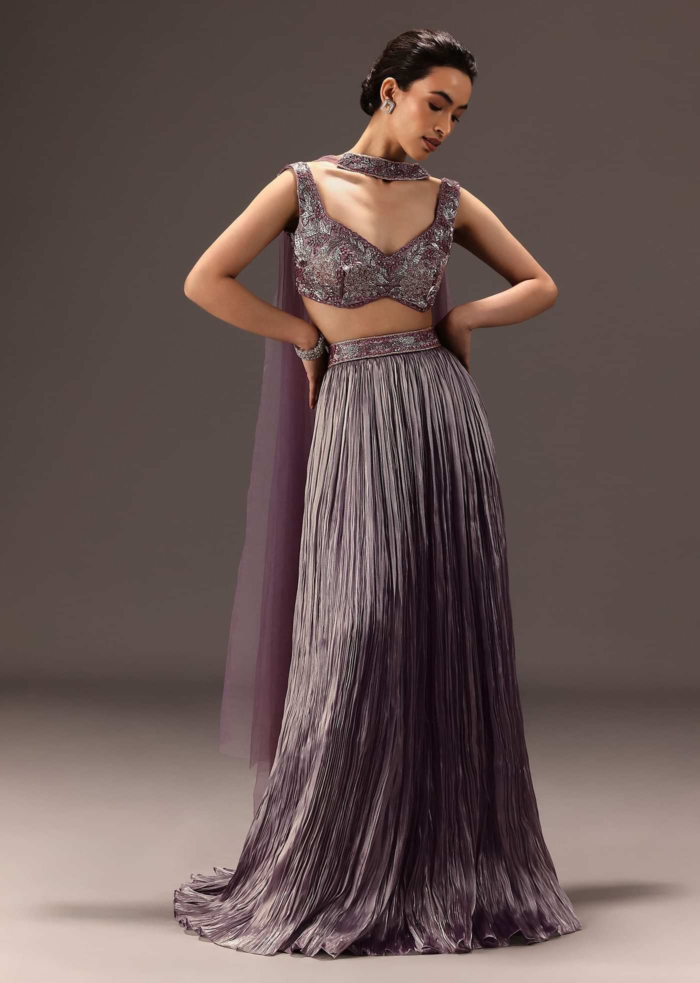 Purple Organza Hand Embellished Ruched Lehenga Set With Choker Dupatta